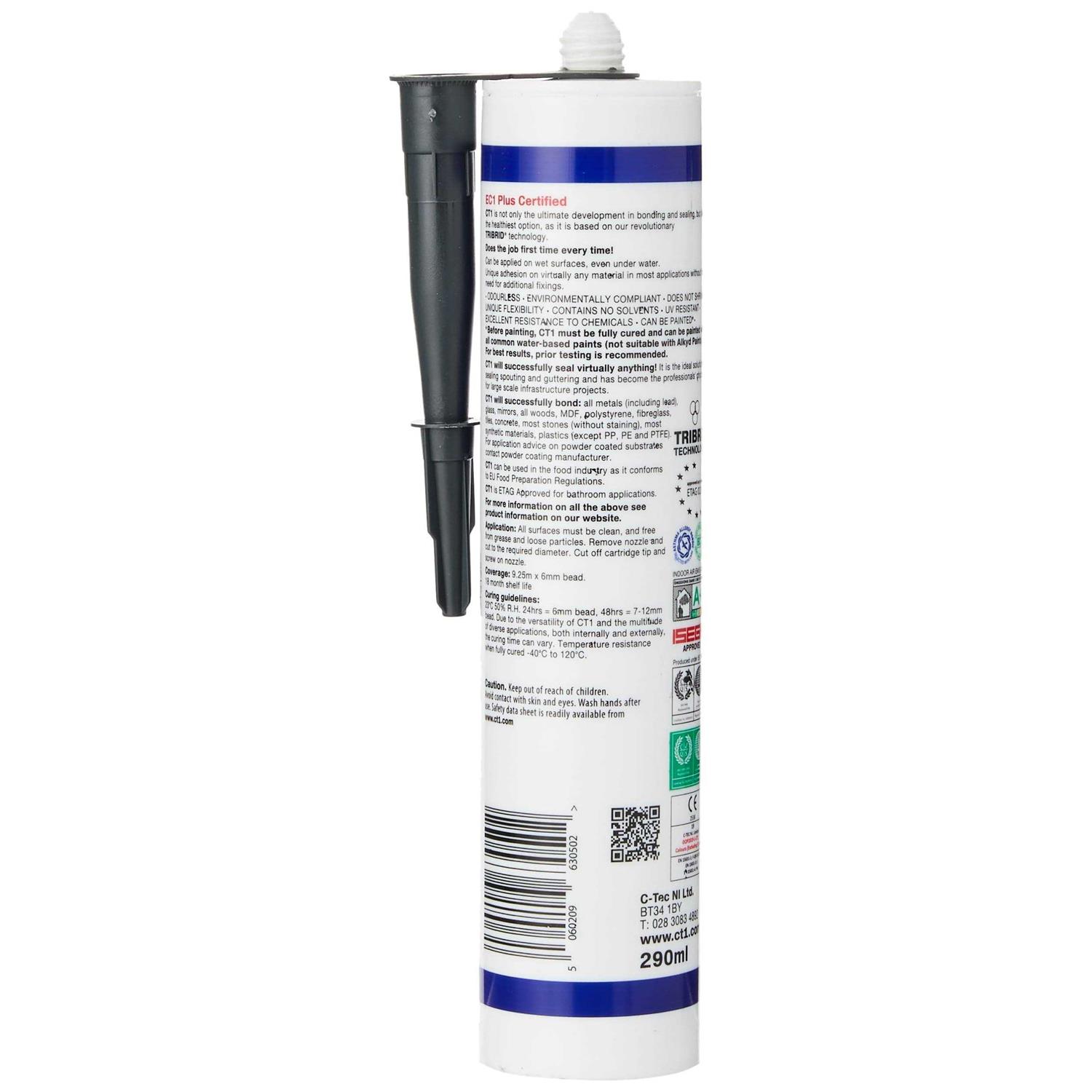 The CT1 Sealant anthracite utilises our unique TRIBRID Technology to provide an all-in-one solution to sealing and bonding in an exterior or interior setting. Stronger than a traditional hybrid polymer. Provides excellent colour retention, resistence to chemicals and is environmentally compliant. This sealant adhesive also offers resistance to vibrations and works well in wet or dry conditions. Perfect for use in your bathroom, marine and boating maintenance, accident emergency repairs, as a fish tank sealant, or kitchen sealant. Can be used outside or inside. Does not contain solvents, does not shrink and has unique flexibility. This sealant can also be painted as required. Successfully bond all metals, glass, mirrors, all woods, MDF, polystyrene, fiberglass, tiles, concrete, most stones (without staining), most synthetic materials, plastics (excluding PP, PE, and PTFE).