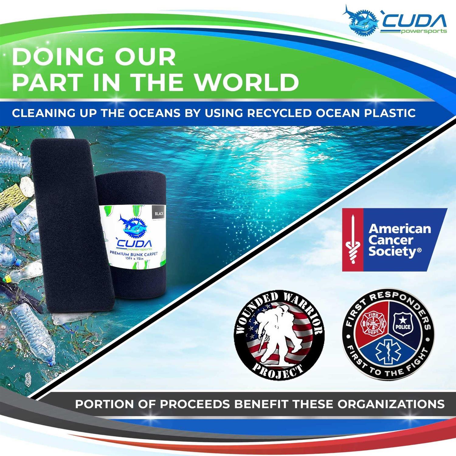 8″ WIDE x 12′ LONG trailer bunk carpet roll. Allows you to cover 2×4 bunks perfectly. Leaves 1.5” of opening at bottom of bunk board, allowing boards to dry out. Use as marine carpet for boat trailers bunk boards up to 11.5 feet long WOUNDED WARRIOR, AMERICAN CANCER SOCIETY – Sales of bunk carpet for boat trailers benefits Wounded Warrior & American Cancer Society. Buying bunk boat carpet, marine carpet & boat bunk carpet for your boat/jet ski trailer supports troops & loved ones THICK & DURABLE – Premium boat runner carpet with thicker pile height & strong backing. Protect the underside of your boat/jet ski, boat trailer bunk with the heaviest most durable UV resistant black bunk padding for boat trailers & bunk rail carpet INDOOR OUTDOOR CARPET – Carpet Roll is extremely durable, 23oz weight, proprietary backing that accepts all glue/adhesives. Boat trailer bunks or marine carpet for boats retains no water, resists weathering & engineered for overall longevity BUY WITH CONFIDENCE – Boat trailer bunk carpet made of highest quality boat carpet materials. Marine bunk carpet, boat trailer carpeting or bunk trailer carpet provides maximum protection. Buy trailer bunk carpeting, boat trailer carpet for runners 8in Wide and 12 Feet Long PREMIUM Bunk Carpet for Boats, Jet Skis, trailers, lifts, and marine carpet applications provide superior protection for the underside of your watercraft. Our proprietary carpet backing is a single application latex that has been engineered to provide superior adhesion to bunk boards – especially when using carpet adhesive. This carpet does NOT come with a rubber backing. Rubber backed carpet is made for boat and marine flooring applications to provide cushion under your foot, but under heavy loads (loading/unloading boats) that carpet fails prematurely. Watch our posted video for comparison. Our backing will not fail! Zero water retention enables bunks to dry quickly and preserve the bunks, runners, guides underneath. Made of High-Quality marine polyester to ensure durability and longevity over time. The thick and soft indoor outdoor carpeting roll fabric has a strong durable backing for carpet adhesive, carpet glue, and staples to secure to trailer runner and fenders. Superior bunk padding keeps the hull protected from scratches while loading a boat to, from, on a trailer of boat lift. Marine carpet roll is longer, wider, and thicker than other competitors, allowing you to cover more bunks or runners per roll. Color – Pure Black Size – 12 feet long x 8 inches wide Material – 100% Polyester. Reasons to choose Cuda Powersports boat trailer carpet 1. Thicker Pile (Height) to provide superior protection 2. Heavier, more durable product by weight 4. 8”W roll is the perfect size to cover 2” x 4” bunk boards 4. Premium Quality 5. Strong Durable Backing 6. Resists all weather, UV, stains, odor, oil, gas, and more 7. Retains flexibility over time 8. Dries quickly; zero water retention 9. Bunk carpet is soft to protect your boat Protect your boat and watercraft with a premium product. Buy Cuda Powersports Premium Marine Carpet for SUPERIOR PROTECTION!