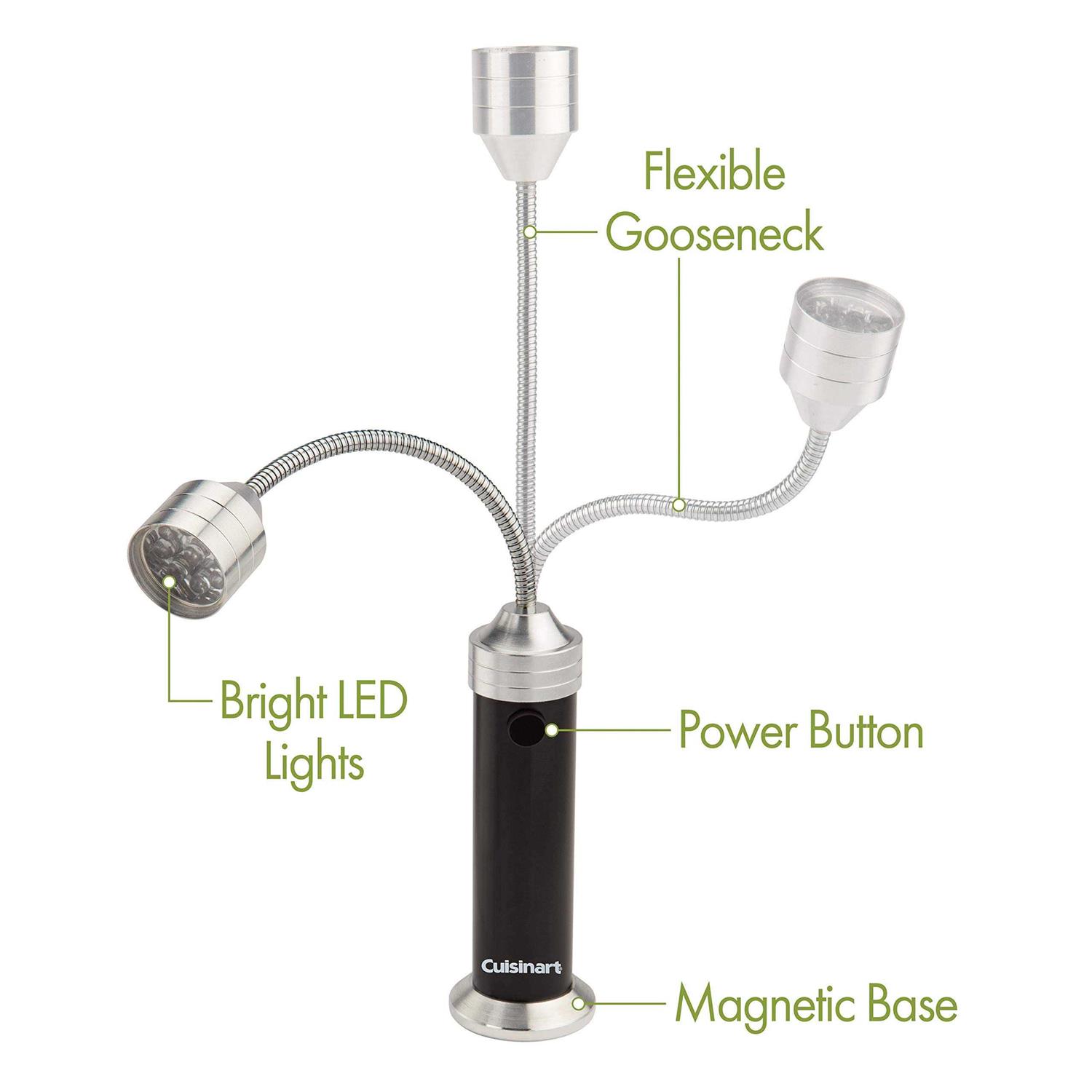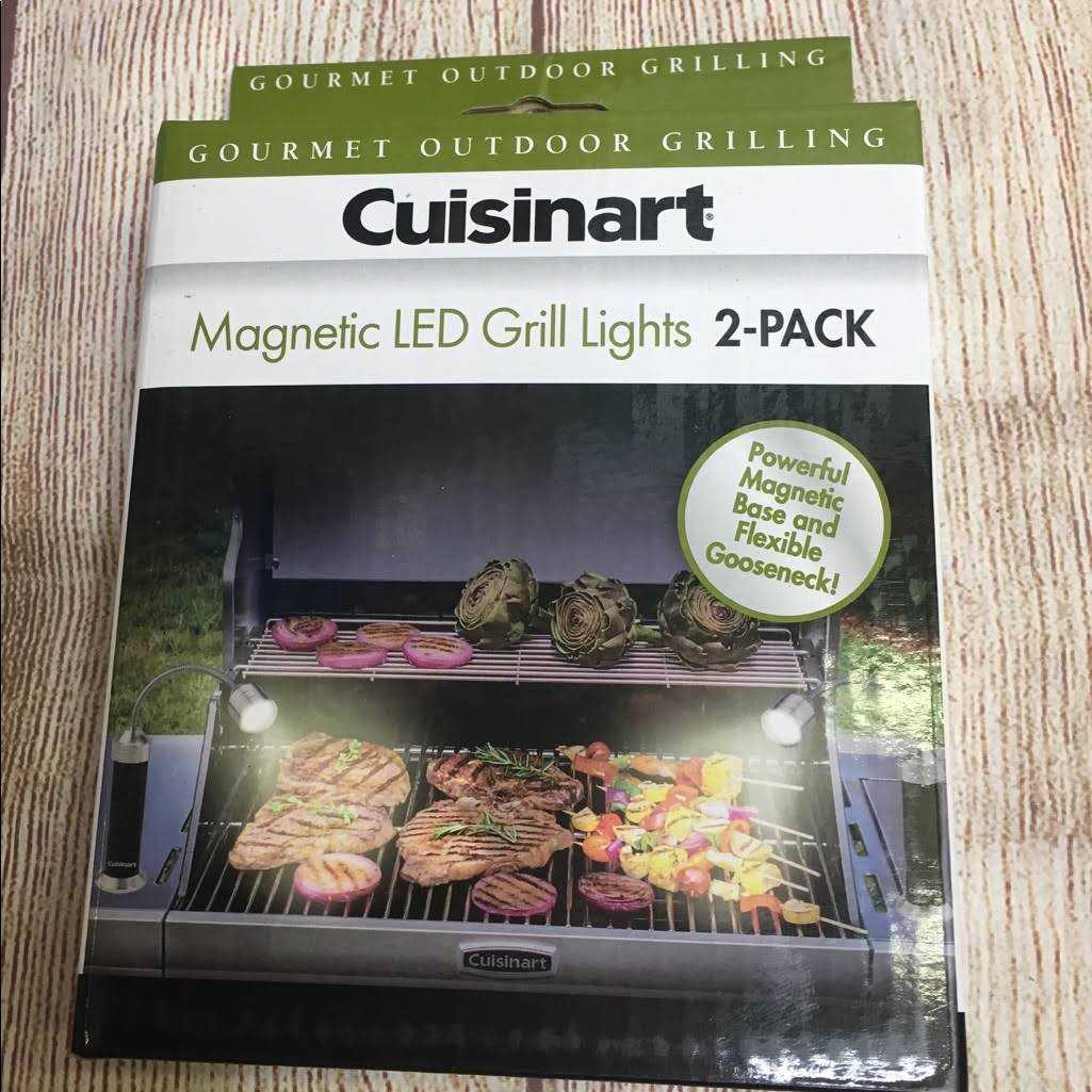 Keep the grill going even when the sun goes down with the Cuisinart magnetic LED grill lights. Lightweight, cordless, plus easy to pack and carry, these lights are great for patio and portable use. Strong magnetic bases fix to most metallic surfaces, providing a bright light where you need it the most. The flexible goose neck can bend and turn in any direction you choose, and it keeps the position, so you dont lose that bright spotlight! Dont let the dark lead you to over or undercooking your meal! Let Cuisinarts magnetic LED grill lights illuminate your grilling experience to cooking perfection.