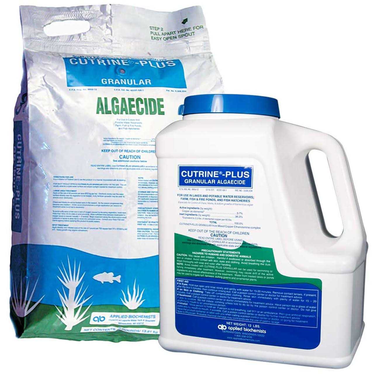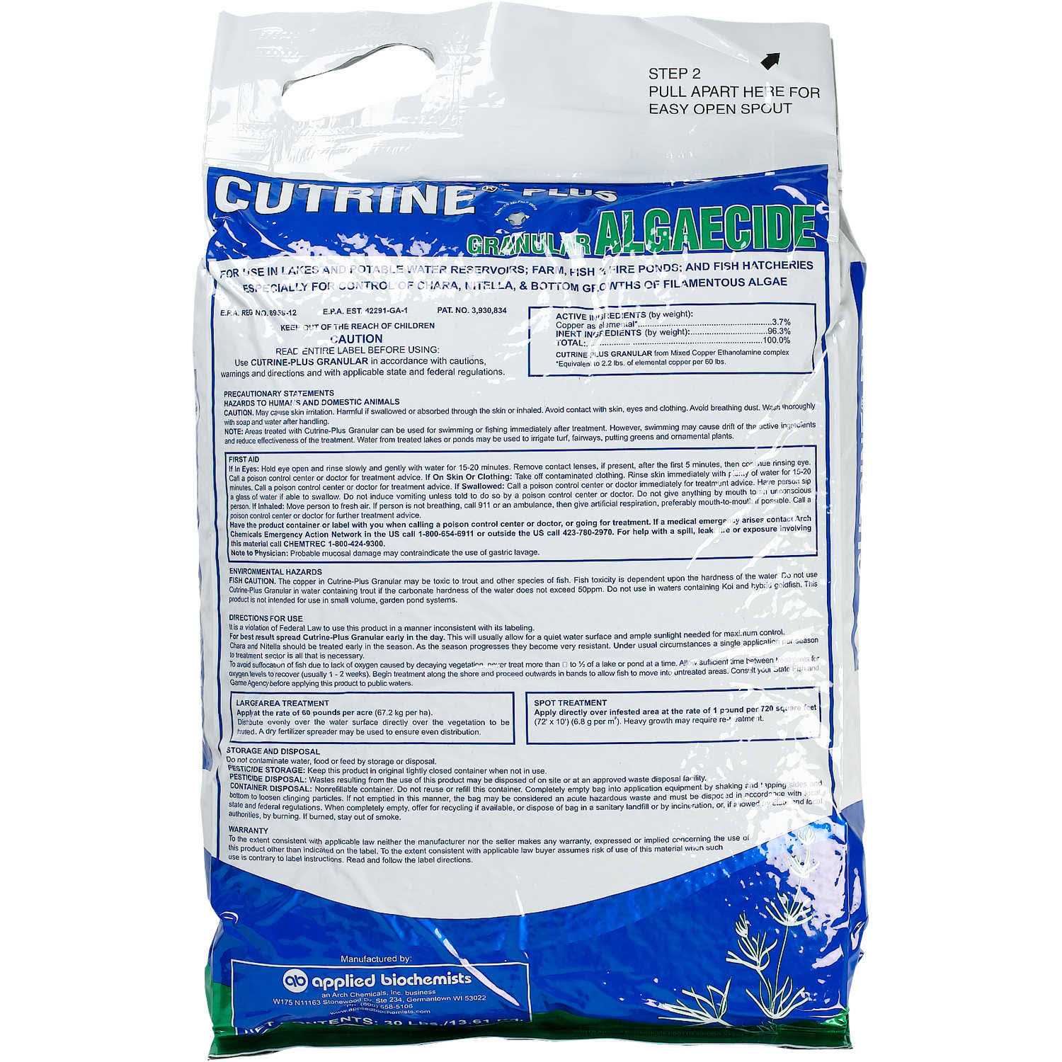 Cutrine Plus Granular Algaecide is an algaecide from Applied Biocheists capable of quickly clearing acres of troublesome bottom growing algae particulary Chara Nitella Filamentous and Hydrilla. When under control algae is serves a useful purpose in their environments from stabilizing sediments to providing food for fish birds and other aquatic life. However algae can grow out of control interfering with recreational uses of the affected area as well as hurting the resident aquatic life. That is where Cutrine Plus Granular Algaecide comes in offering 5 to 6 weeks of algae control. When treating the body of water only treat 1/3 of the area at a time to avoid oxygen depletion of the water which could be fatal to the fish population. Safe to use with no water use restrictions when used as directed on the label. Use Cutrine Plus for clear and clean water. Also comes in the liquid form – Cutrine Plus Algaecide which is great for surface algae. This one the granular form is ideal for bottom growing filamentous algae Chara and Nitella. Liquid version must be diluted prior to use while the granular form is ready to use.