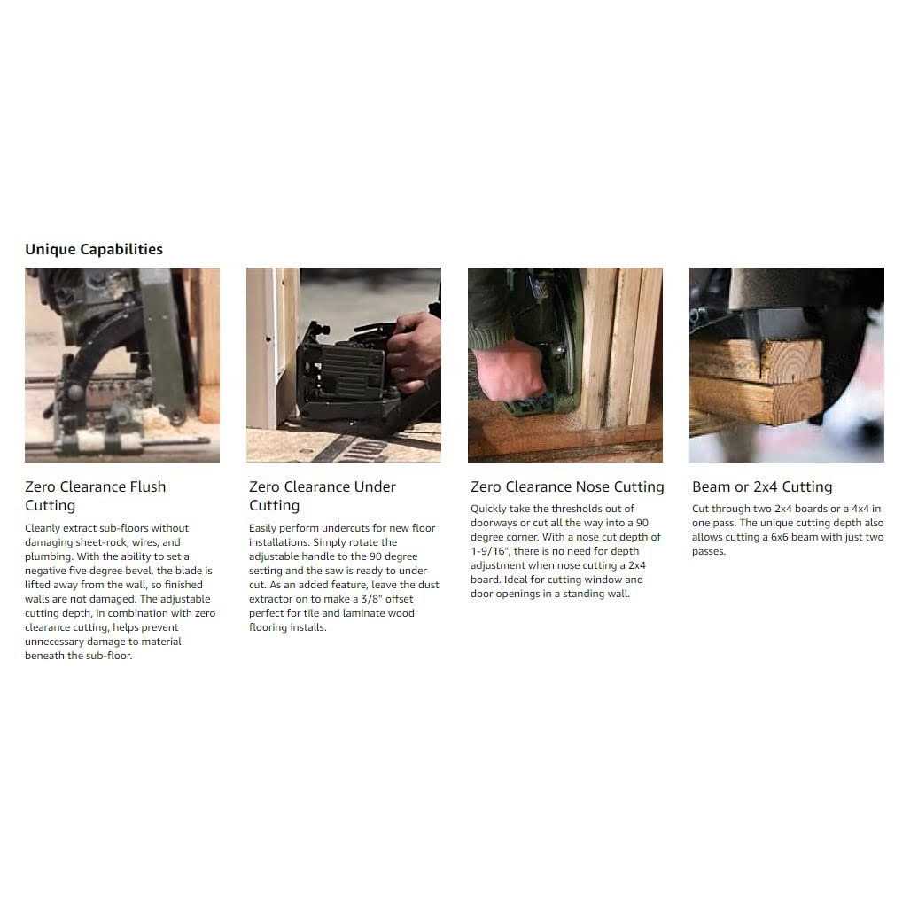 Cuz-D SFS-85 Circular Multipurpose Straight Flush Saw This Straight Flush Saw was designed for the people that earn a living with their tools. Built to compete, out-perform and out-last. This revolutionary design allows flush cutting, under cutting, cutting into 90 degree corners, and a max cut depth of 3-1/8′. All these features and much more with the familiar feel of a standard circular saw. The Straight Flush Saw was designed for the people that earn a living with their tools. Built to compete, out-perform and out-last. Light weight magnesium alloy construction prevents user fatigue during all day use Trigger actuated lower guard for safe operation Bevel cutting capability from -5 to 65 degrees with flexible adjustable depth settings 8 1/2 inch blades with 3-1/8â€? depth cut and 1-9/16â€? nose plunge cut capacity to cut larger lumber in a single pass