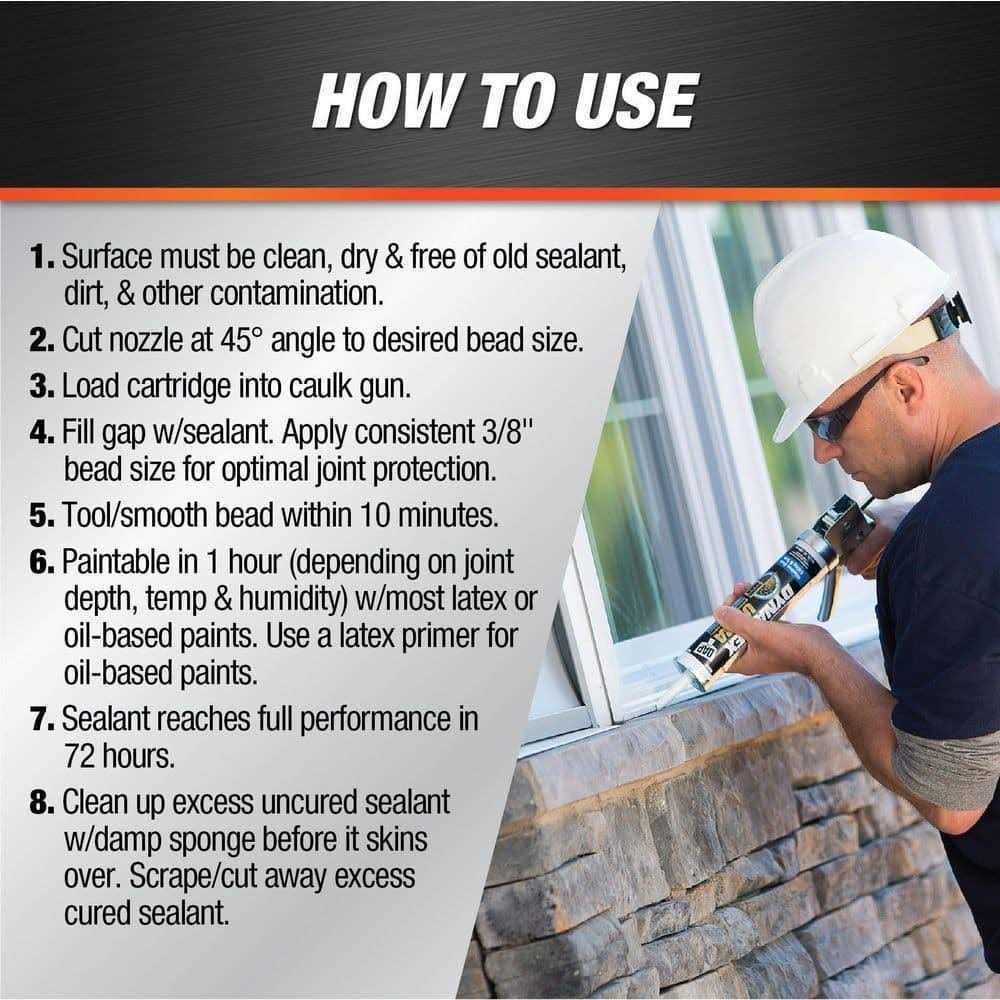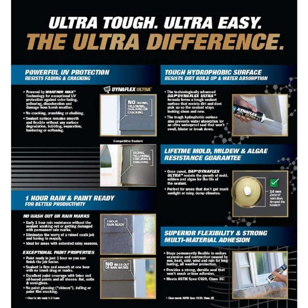 DYNAFLEX ULTRA advanced exterior sealant for windows, doors, siding and trim is powered by innovative WEATHER MAX technology for long-lasting, all weather protection. It provides exceptional UV resistance against color fading, yellowing, cracking, chalking and crumbling so the sealant stays looking new. Once cured, DYNAFLEX ULTRA resists mold, mildew and algae for the life of the sealant. The tough surface resists dirt build-up and water absorption for a durable, 100% waterproof seal that stands up to the elements. It has strong multi-material adhesion and stays permanently flexible to endure expansion and contraction caused by sun, heat, cold, wind and rain. It is rain and paint ready in one hour to save time and provide better productivity. Easy to gun out for less fatigue and smooth tooling for a better finish. Easy water clean up and low odor.