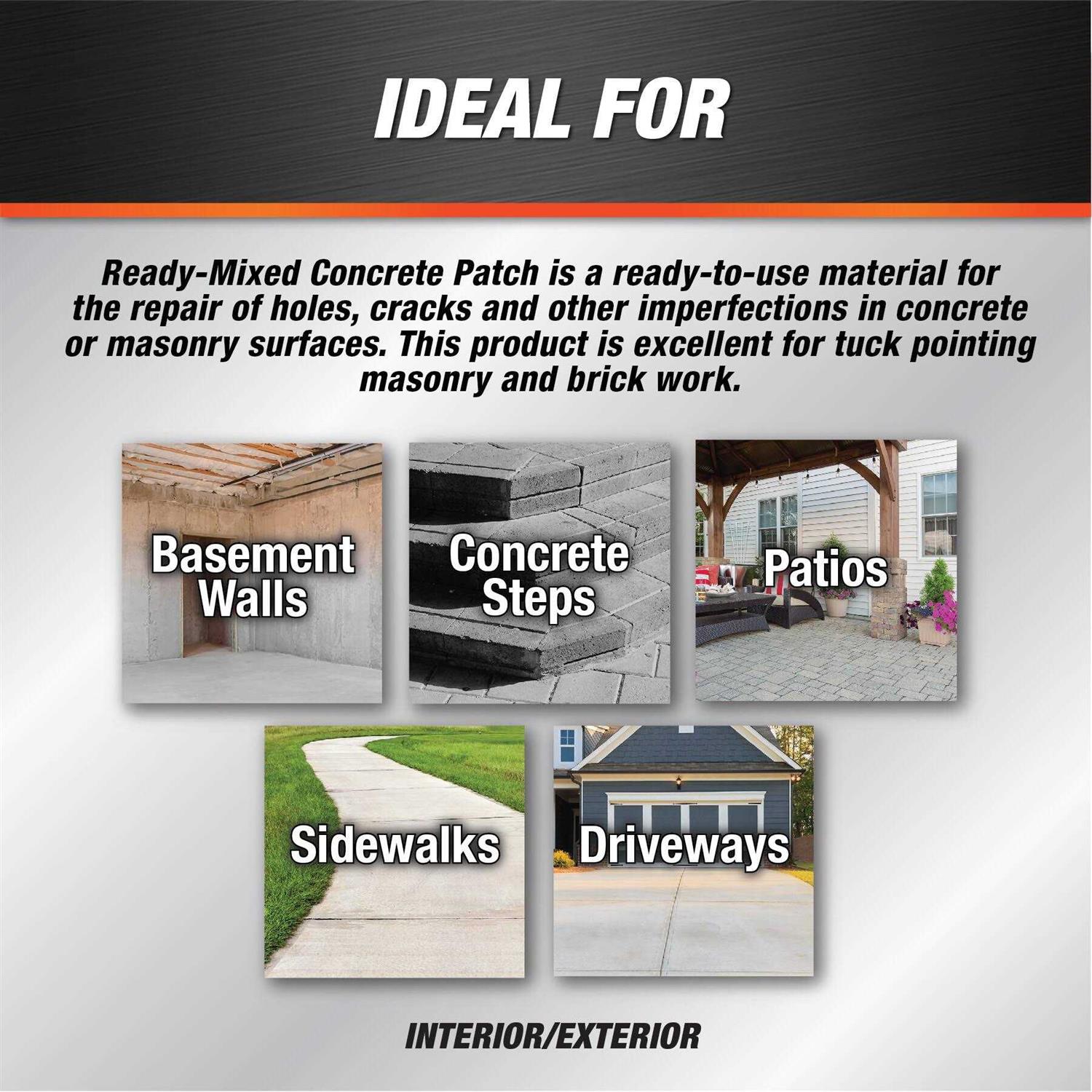 Used to patch small cracks and breaks, or spot level concrete and masonry surfaces such as basement walls, patios, steps, sidewalks and driveways. It dries to a surable, hard finish and is non-shrinking. Interior/exterior use.