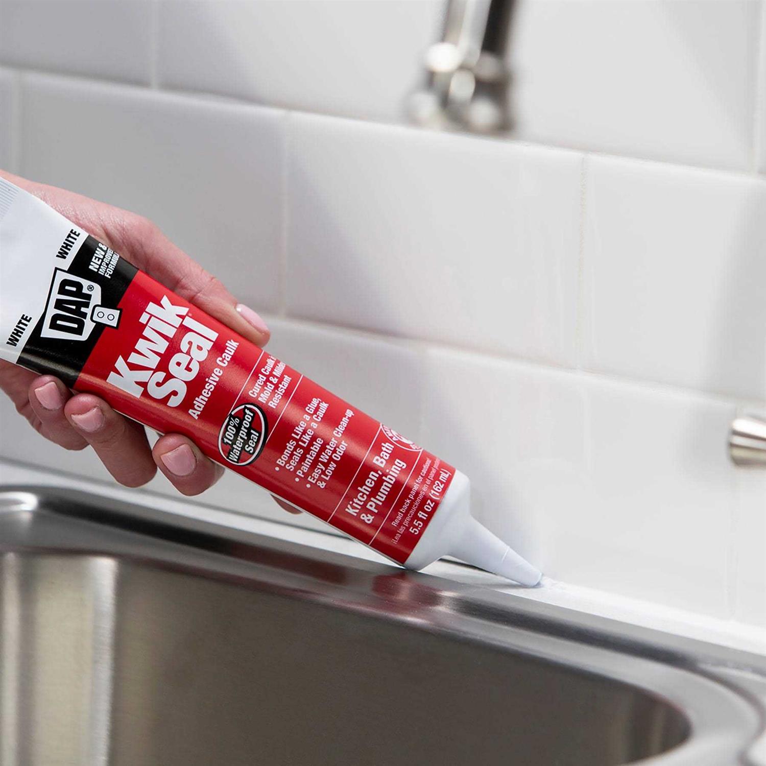 DAP KWIK SEAL kitchen and bath adhesive caulk is an easy-to-use adhesive caulk that bonds like a glue and seals like a caulk. It provides a 100% waterproof seal around tubs, sinks, showers, countertops and fixtures. It can also be used to repair loose tiles and fixtures. KWIK SEAL tools easily and is tack-free in 15 mins. It is paintable, low in odor and cleans up easily with water. Provides a durable, watertight seal. Provides a durable, watertight seal. Excellent adhesion and flexibility. Cured caulk is mildew-resistant. Bonds like a glue and seals like a caulk.