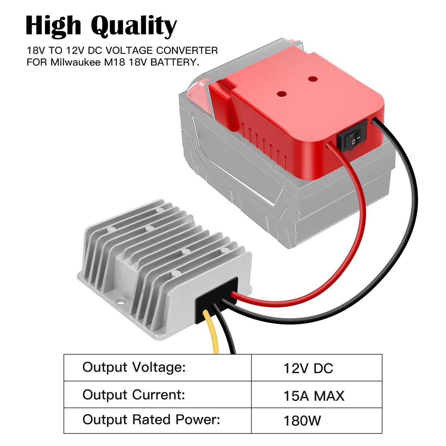 Perfectly compatible with Milwaukee M18 battery 18v series 48-11-1815 / 48-11-1820 / 48-11-1828 / 48-11-1840 / 48-11-1850 / 48-11-1860 and more. Power adapter connector is well-made, snug fit your battery, can install and lock battery easily. Battery adapter added switch ensures you can turn on&off the battery easily. Input voltage range: DC 18V-20V; Output voltage: DC 12V; Output current: 15A MAX; Output Power 180W. Our voltage buck converter adopted synchronous rectification technology further improve conversion efficiency and good stability. Power conversion efficiency can reach 95%; Ripple wave: 50Mv; Starting delay time:≤2S. Better safety, voltage regulator equipped smart chip, provides Over-current, Over-load, Low-load, Over-voltage, Under-voltage, Over-heat and Short-circuit intelligent protection. High quality & Easy to use, DC 18V to DC 12V Step down converter made of aluminum shell with epoxy potting, waterproof, anti-dust, anti-humidity, anti-shock and better heat dissipation, more durable. Just install the battery to the battery adapter and then connect the voltage converter to your device. (Note: Battery NOT Included) Widely used, this power inverter suitable for various 12v devices ideal for upgrade motor, ride on toys, golf carts, car trucks, speaker, monitoring equipment, power tools, led strip light, work lights or robotics DIY etc. br/ Step down converter compatible with Milwaukee M18 18-volt Li-ion batteries (48-11-1815 / 48-11-1820 / 48-11-1828 / 48-11-1840 / 48-11-1850 / 48-11-1860, etc.) Power adapter connector is well-made, snug fit your battery, can install and lock battery easily. br/ br/ Input voltage range: DC 18V-20V; Output voltage: DC 12V; Output current: 15A MAX; Output Power 180W. Our voltage buck converter adopted synchronous rectification technology further improve conversion efficiency and good stability. Power conversion efficiency can reach 95%. br/ br/ Voltage regulator equipped smart chip provides Over-current, Over-load, Low-load, Over-voltage, Under-voltage, Over-heat and Short-circuit intelligent protection. Just install the battery to the battery adapter and then connect the voltage converter to your device. Ideal for upgrade motor, ride on toys, golf carts, car trucks, speaker, monitoring equipment, power tools, led strip light, work lights or robotics DIY etc. br/ br/ Note: br/ 1. This converter is not a charger, it only outputs the voltage and power directly from your battery. br/ 2. When using, make sure that the positive and negative wires of the device correspond to the positive and negative wires of the adapter. br/ 3. If not used for a long time, please be sure to remove the battery form the adapter. br/ 4.