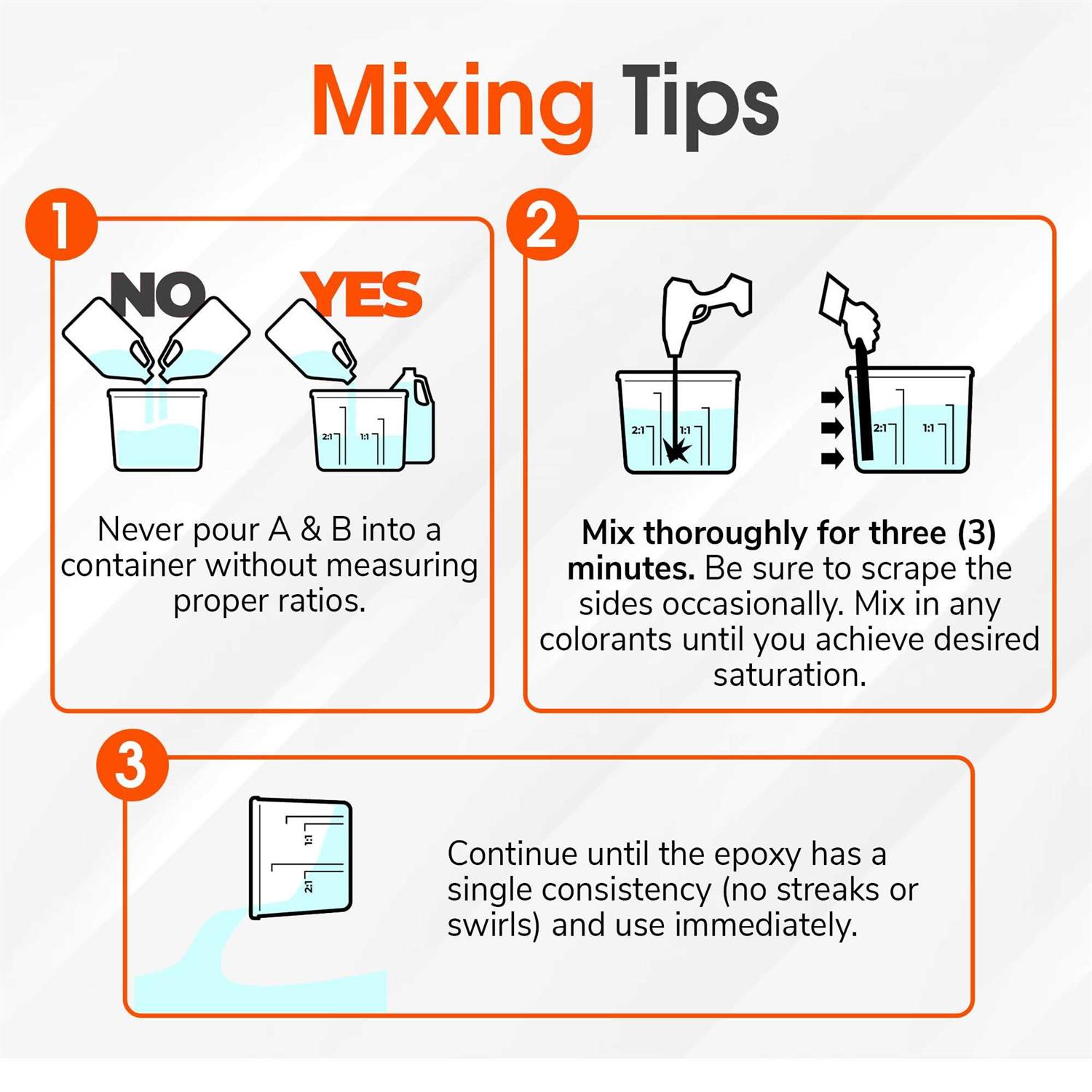 Kit is a super wet gloss epoxy for bar and table top epoxy coating. This wood and concrete counter top epoxy is a super clear self-leveling high gloss finish table top epoxy that is UV stable for surface flood coating. This table and bar top epoxy produces a rich super gloss look and looks like liquid glass. It is typically used for a 1/8 in. thick finish coat for bar tops, tables, river tables and most any table or counter top surface. It can be tinted with mica powders, dyes and alcohol pigments for stunning faux finishes. It delivers a super clear flood coat ideal for applications requiring a high level of see through transparency and high gloss. WiseBond Bar and Table Top Epoxy features a 1:1 mix ratio and a low exothermic reaction cure, giving plenty of time to perfect your wood table project. It has virtually no odor and can be used indoors without ventilation or bulky respiration equipment. Each epoxy kit includes a resin (Part A) and a hardener (Part B). The 1 Gal. kit includes 1/2 Gal. of resin and 1/2 Gal. of hardener. Mix equal parts of A and B together. Mix thoroughly for 3-minutes and apply to the surface between 77°F – 85°F. Allow 24 hours between pouring additional layers. Wait 3-days for a full cure and 30-days for a full hard cure.