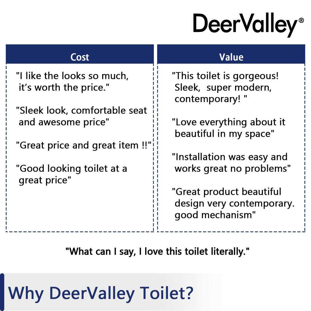 DeerValley This toilet will complete your modern bathroom with the contemporary back to the wall. Features a concealed with a sleek skirted design that is both visually appealing. The strong dual flush function is very dependable offering a never-failing performance. The toilet is easy to install, easy to use, and with its flush actuator at the top of the tank, offers everything you need for comfort and security in the bathroom.