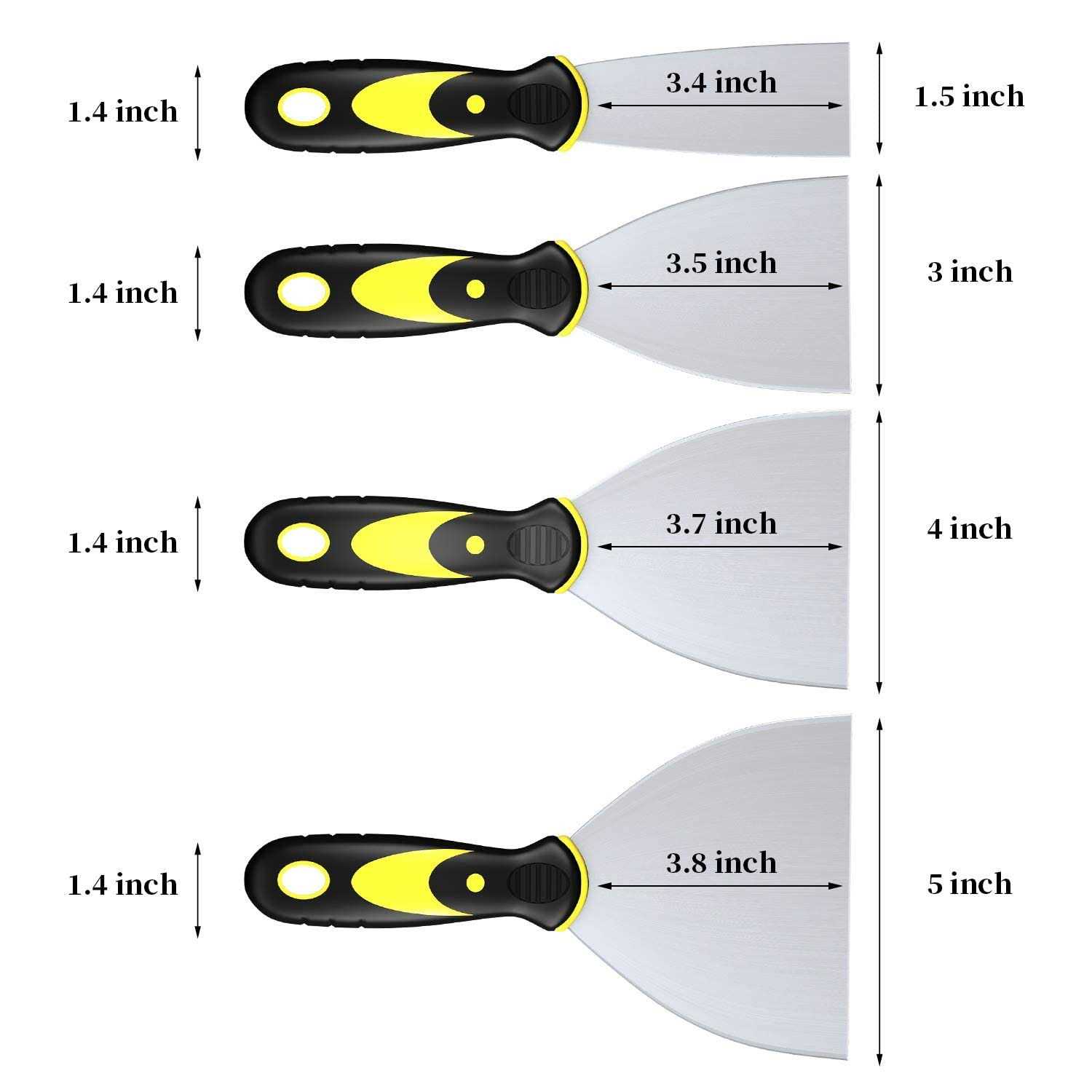 RUST PROOF: High-quality spackling knifebuilt with 3CR13 stainless steel, different from carbon steel materials on the market, this 3CR13 stainless steel undoubtedly featuring strong and corrosion-resistant. Blade in a mirrored polished finish was designed for anti-rust and easy cleanup. ERGONOMIC COMFORT HANDLE: This putty knife scraper set equipped with a large rubber handle gives you a comfortable edge to grasp, and let you work with minimal effort. Unlike wooden handles, this non-slip handle will not decay in moist warm conditions. Hallow design on the handles for easy storage on nails or pegboard. FLEX PUTTY KNIFE: The edge of this putty scraper thickness is designed to be 0.028/0.71mm, more flexible and provides you with great force when you work with it. ASSORTED SIZES: This drywall scraper set comes with 4 different sizes of wideness, varying from 5, 4, 3, 1.5 (12.5cm, 10cm, 7.5cm, 3.8cm), meet your different needs for home drywall repair and more. MULTIPURPOSE: These spackling knives are perfect for many project, including drywall, putty, decals, wallpaper, plaster, baking, spackling, patching, painting, stucco and much more.,Hardware > Tools,DEKEones