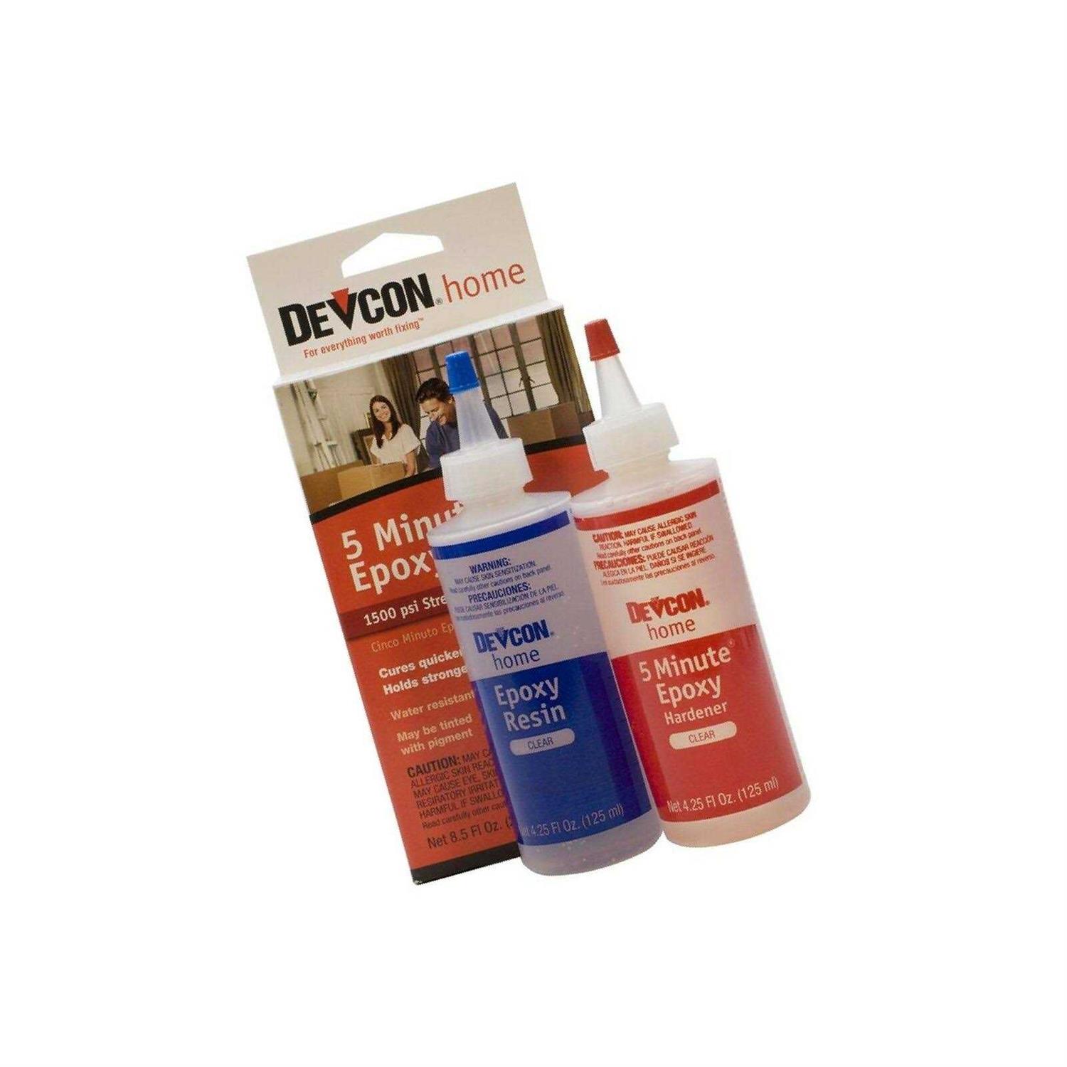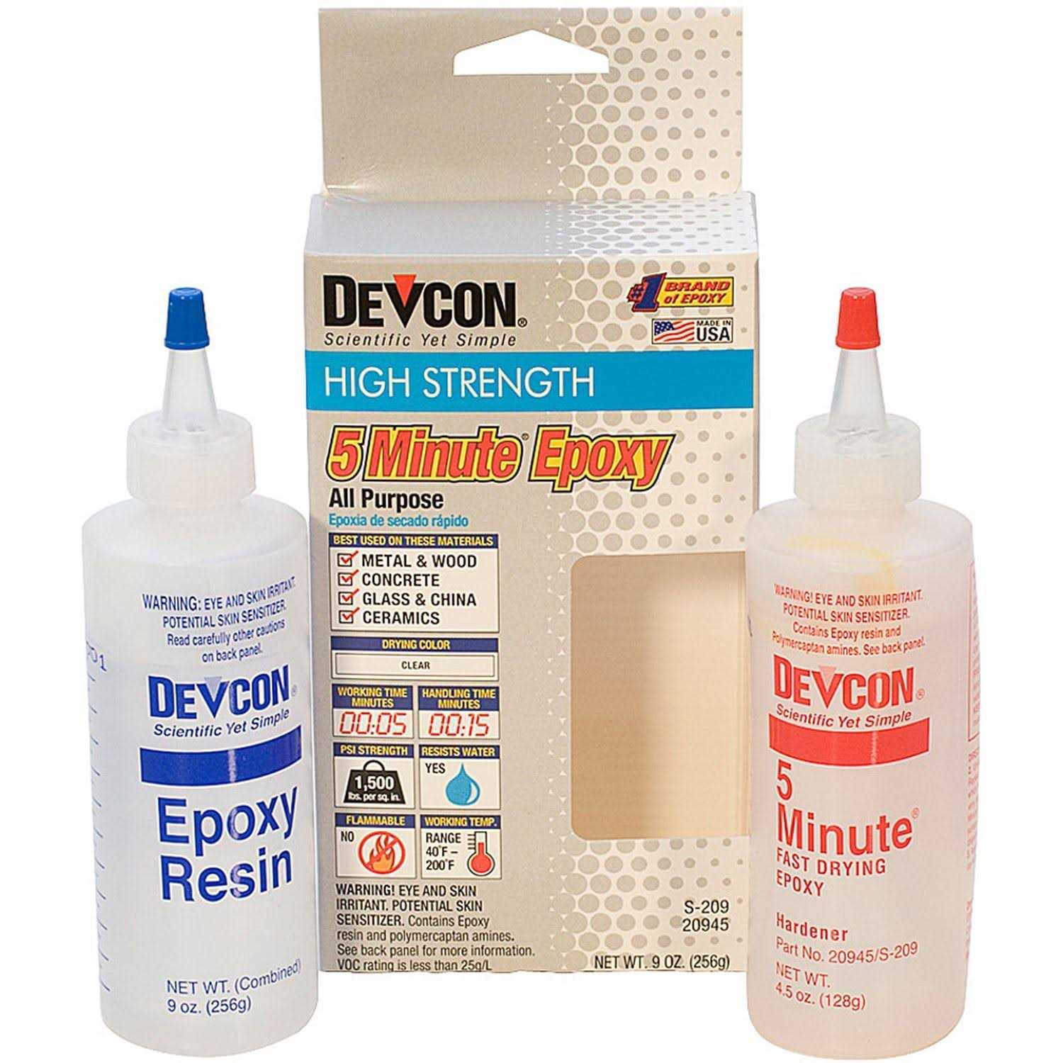 Ideal for joining wood, metal, concrete, glass, ceramics, china and more Sets in 5 minutes with strength up to 1,500 pounds per square inch 2 bottles included; 4-1/2 ounce bottles Dries clear water resistant Devcon 5-Minute Epoxy adhesive cures and joins materials together by a chemical reaction between the resin and hardener. This reaction results in a high strength bond that is resistant to most chemicals. Use Devcon Epoxy adhesive for household, industrial, crafts or for any job that requires a high-strength, high-quality bond. Works best on metal, wood, concrete, glass, ceramics, china and much more. 5 Minute Epoxy sets in 5 minutes with strength up to 1,500 lbs. per square inch. Dries clear; water resistant. Includes 2 bottles with 4-1/2 ounces of epoxy.
