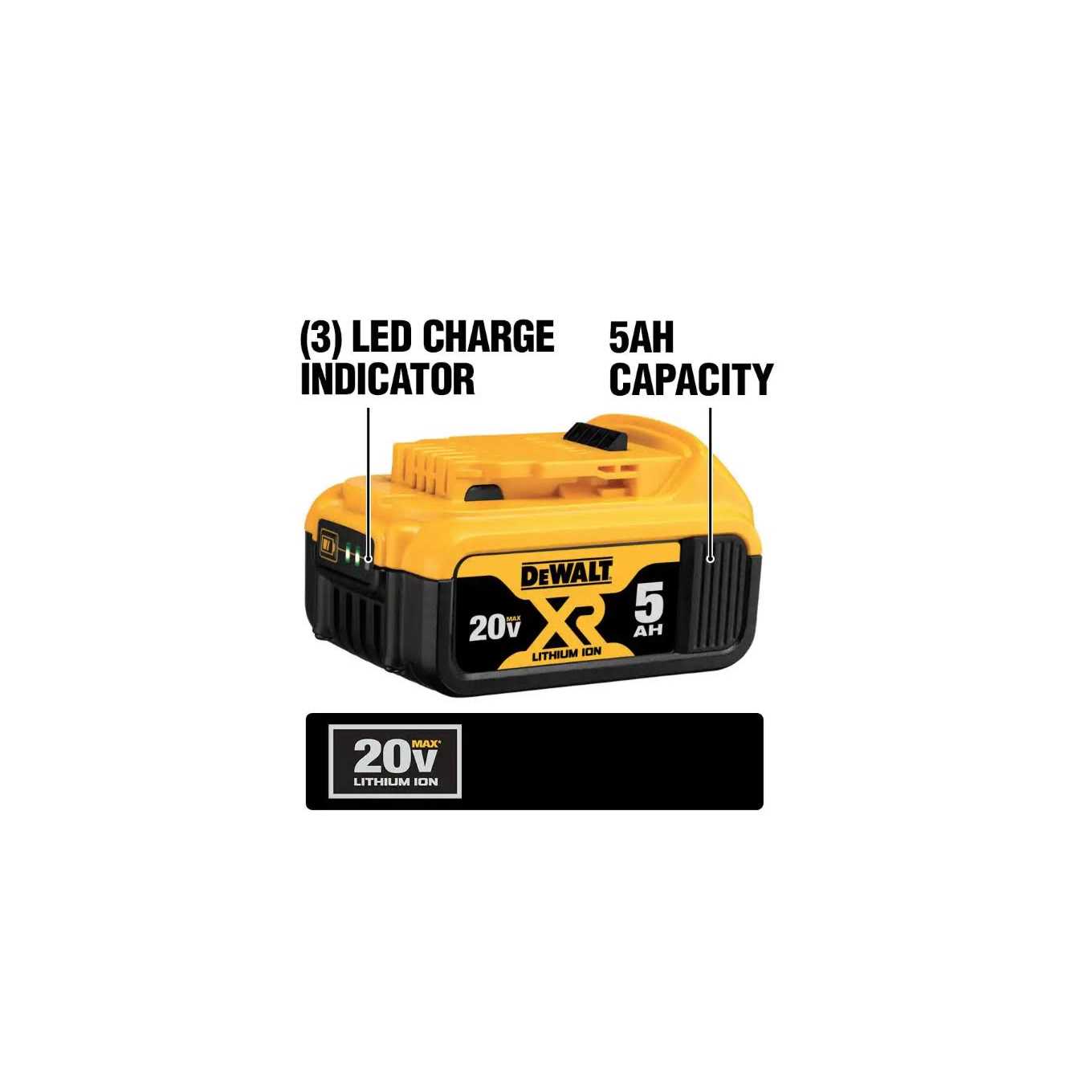 DEWALT’s XR 5.0Ah Lithium Ion Battery/Charger Kit provides up to 60% more capacity than standard 20V MAX* battery pack (DCB200). This 5.0 Ah Lithium Ion battery is lightweight at 1.4 lbs each and compatible with the entire line of 20V MAX tools. It’s a 5.0Ah high capacity battery pack that has no memory and virtually no self-discharge for maximum productivity and less downtime. It offers a 3-LED fuel gauge system that allows immediate feedback on state of charge.