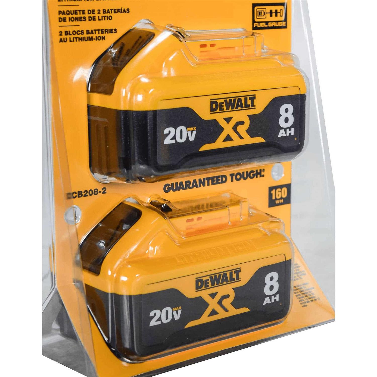 Cordless tool batteries dual pack – 20 v max lithium-ion Provides the highest capacity within the Dewalt 20 volt Max XR lineup. Using state-of-the-art Lithium-Ion technology the DCB208 8 Ah delivers up to one third more run time while maintaining the same size and weight as the 6 Ah battery. Includes fuel gaug e LED charge indicator. Compatible with 20 volt Max tools and chargers. Each Lithium-Ion battery weighs only 2 lbs.