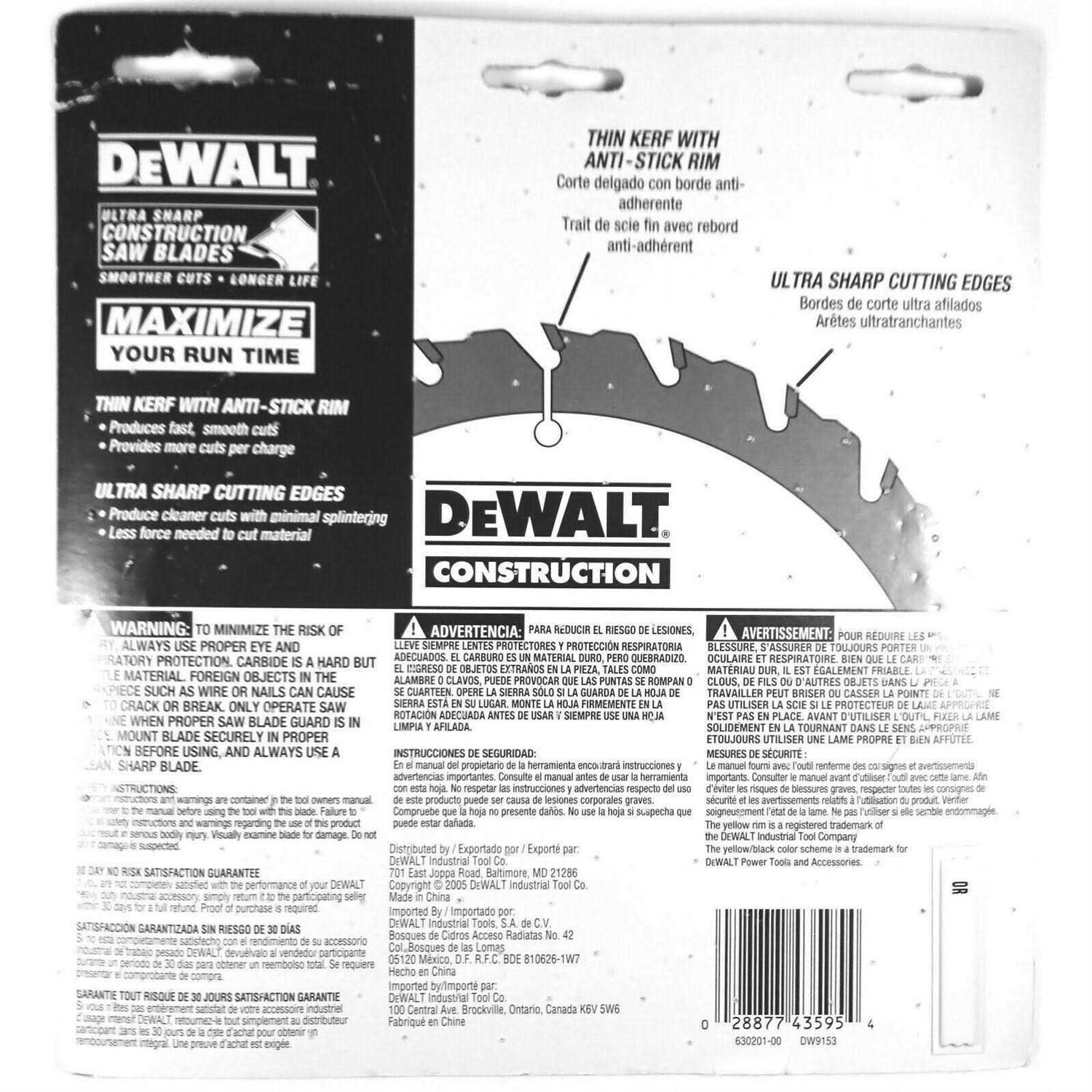 Featuring tungsten carbide teeth for maximum durability and a thin kerf for fast, smooth cuts, DeWALT small diameter construction saw blades power through a variety of building materials with ease. Ribbed heat vents allow blades to run at cooler temperatures, reducing blade flexing and binding. Anti-stick coating minimizes friction and gum up. Tougher tungsten carbide stays sharper longer. Tougher tungsten carbide stays sharper longer. Thin kerf design results in faster cutting and less drag. All blades feature 5/8 in arbor with diamond knockout. Specially formulated anti-stick coating minimizes friction and gum up for smoother cuts. Ribbed heat vents allow blade to run cooler, reducing blade flexing and binding.