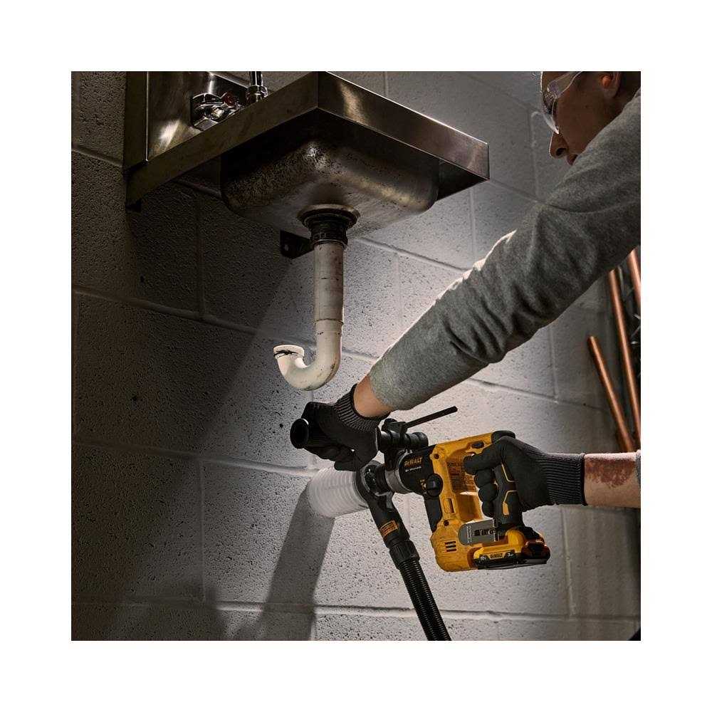 The lightweight and compact design makes this tool ideal for mounting strut, installing conduit, hanging fixtures, pipe clamp anchoring, and maintenance repair operations applications when combined with lightweight masonry screw anchors. This rotary hammer becomes OSHA Table 1 Compliant when used with the DWH200D dust shroud and DWH161D1 dust extractor. Battery and charger sold separately.