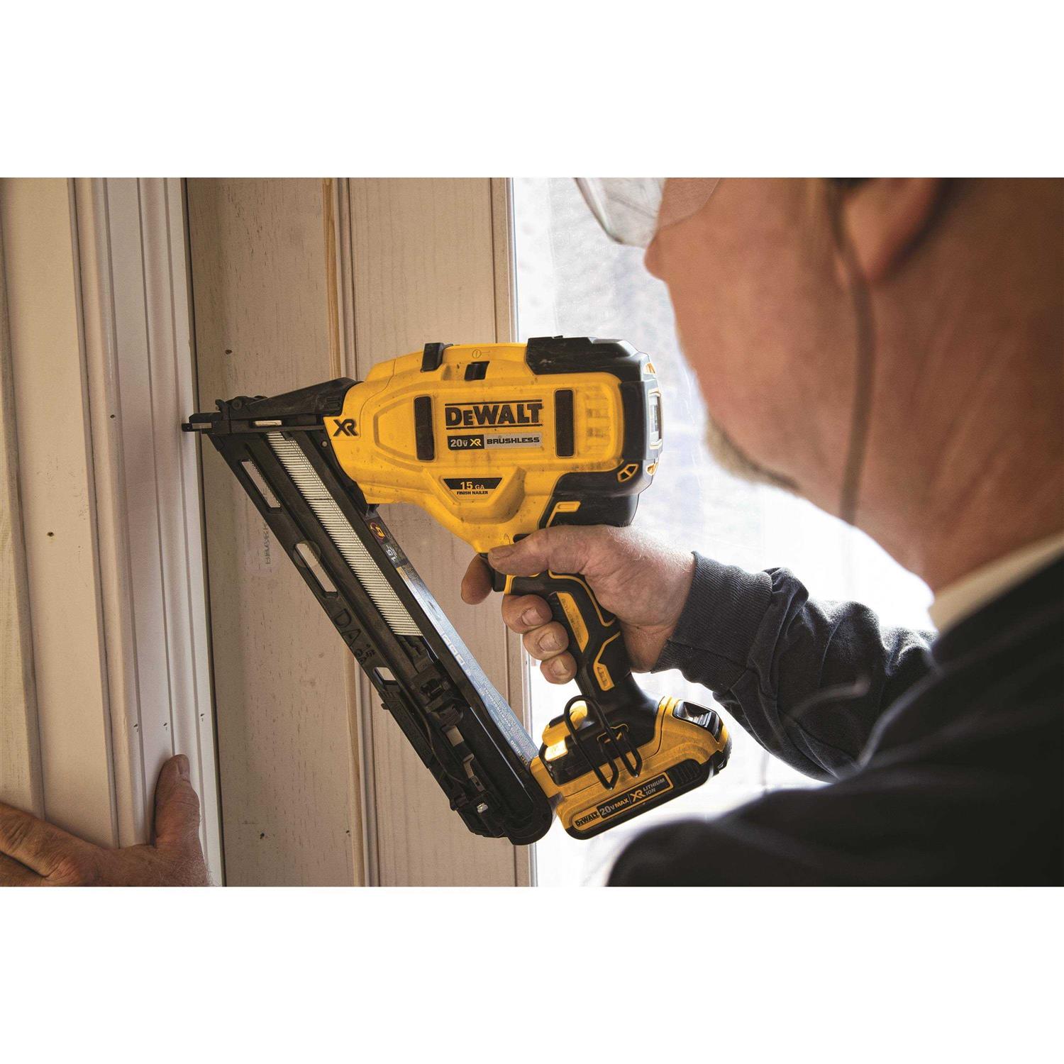 The De Walt Dcn650 15 gauge angled finish nailer drives 15 gauge angled finish nails from 1-1/4 In. to 2-1/2 In. which makes it ideal for fastening crown molding casing baseboards and hardwood floor installation. With its brushless motor powered by a Dewalt 20 V MAX lithium-ion battery the Dcn650 is ready to go to work without the hassle of using gas compressor and hose. Tackle jobs both large and small with the features of a pneumatic tool and the freedom of cordless. Maximum initial battery voltage measured without a workload is 20 V. nominal voltage is 18. 100% battery powered. Eliminates the hassle of using gas compressor and hose. Brushless motor maximizes runtime and durability. Micro nose improves line of sight and accuracy of nail placement Compared to Dewalt Dc628. Tool-free selectable trigger for sequential or contact actuation modes Tool-free depth adjustment for precise countersinking of nails. Tool-free jam release to quickly and easily clear nail jams. Multi-functional LED lights help to provide both workspace illumination and tool diagnostics. Integrated tool-free stall release lever to quickly reset the driver blade in the event of a stall. Adjustable belt hook for left or right attachment depending on user preference. Inline magazine provides easy use in multiple orientations and in tight spaces.