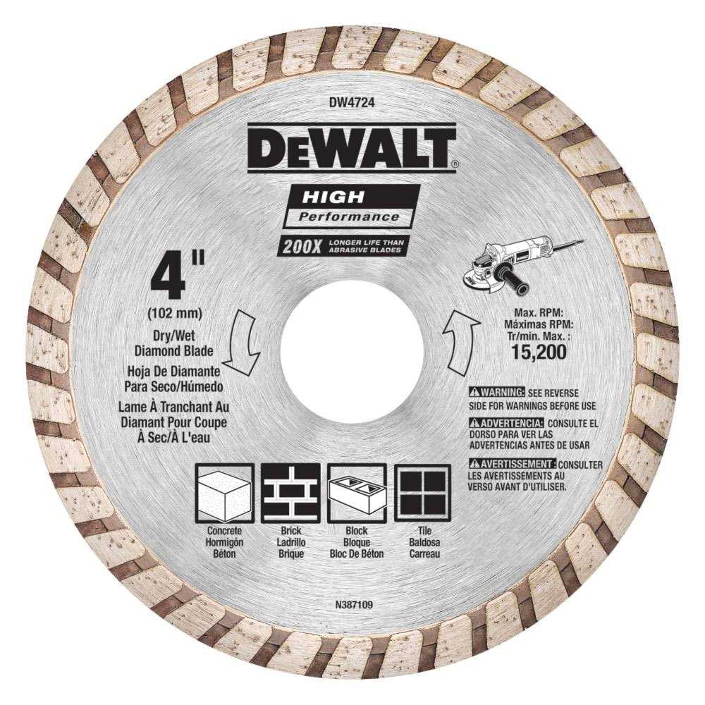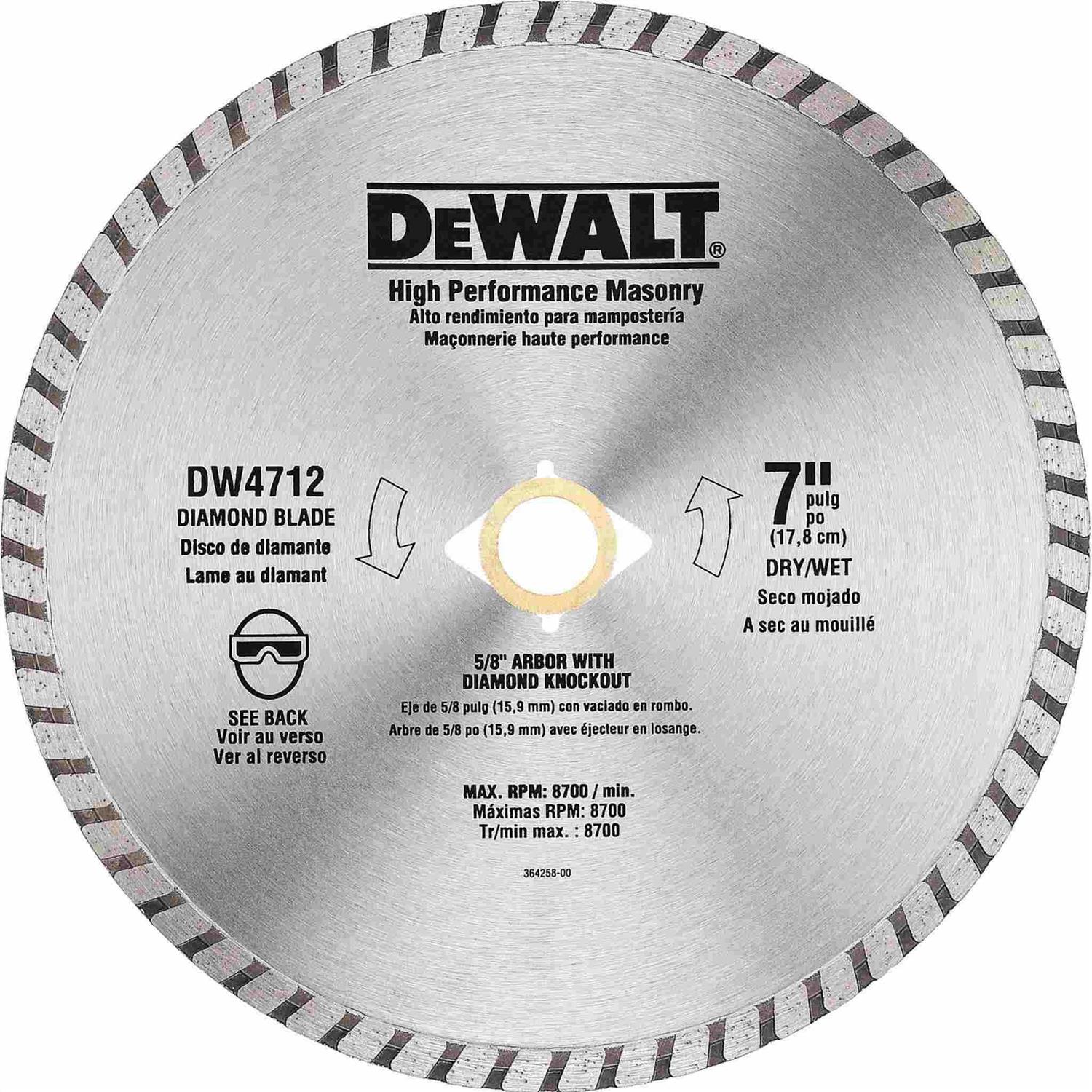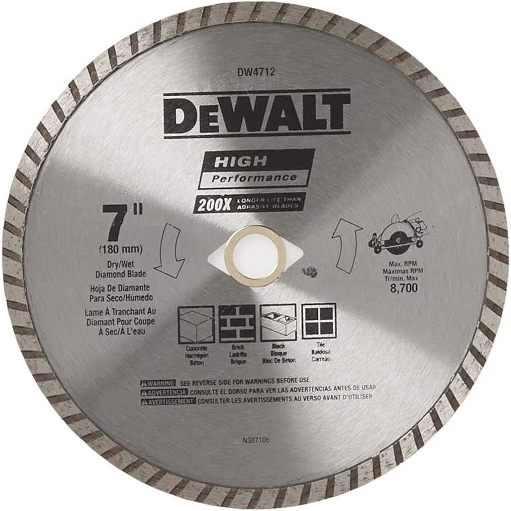 Diamond Blades by DEWALT. Details:The DeWALT DW4712B 7″, high performance masonry blade is a high quality blade intended for cutting brick & masonry material. It features a 5/8″ diamond knock out arbor for a faster cut rate at constant depth which minimizes dust with thinner kerf. It lasts up to 30 times longer than abrasive blades and is for use o n 7″ & 7-1/4″ circular saws.