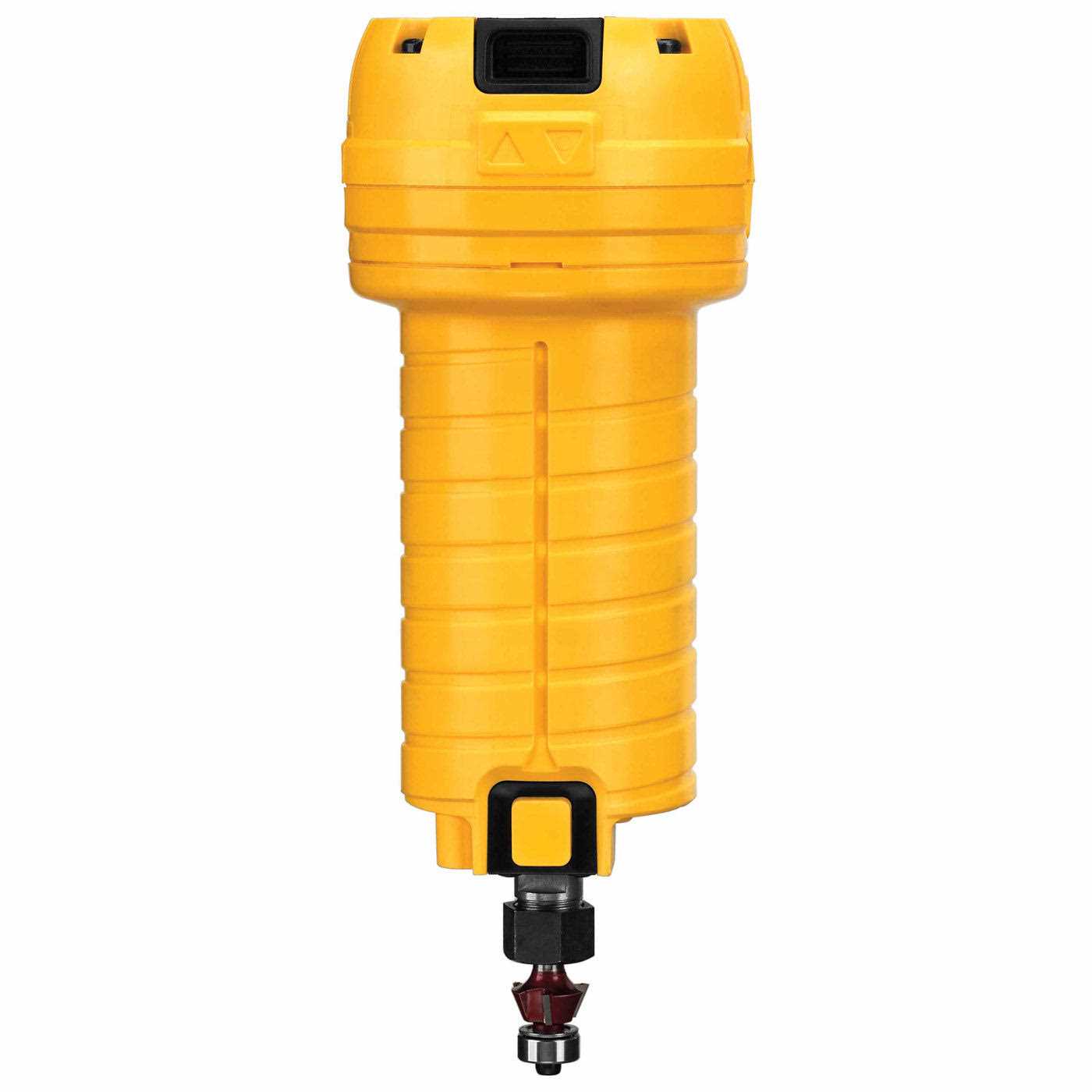 The DWE6000 Laminate Trimmer has a 4.5 Amp motor and is perfect for most trimming, small edge forming and hinge routing applications. LED light and clear plastic fixed base improve visibility while trimming. 31,000 RPM, 4.5 amp motor provides the power and durability required to cut in various materials. Perfect for most trimming, small edge forming, and hinge routing applications. Ergonomics allow for comfortable, single-handed control. Clear plastic fixed base provides long term durability and better line of sight while trimming. Quick release clips to remove the motor from the base. Micro-set collar for quick and accurate bit height adjustments. Spindle lock button allows for single-wrench bit changes. 1/4″ collet. LED light and clear sub-base ensure maximum visibility in operation.