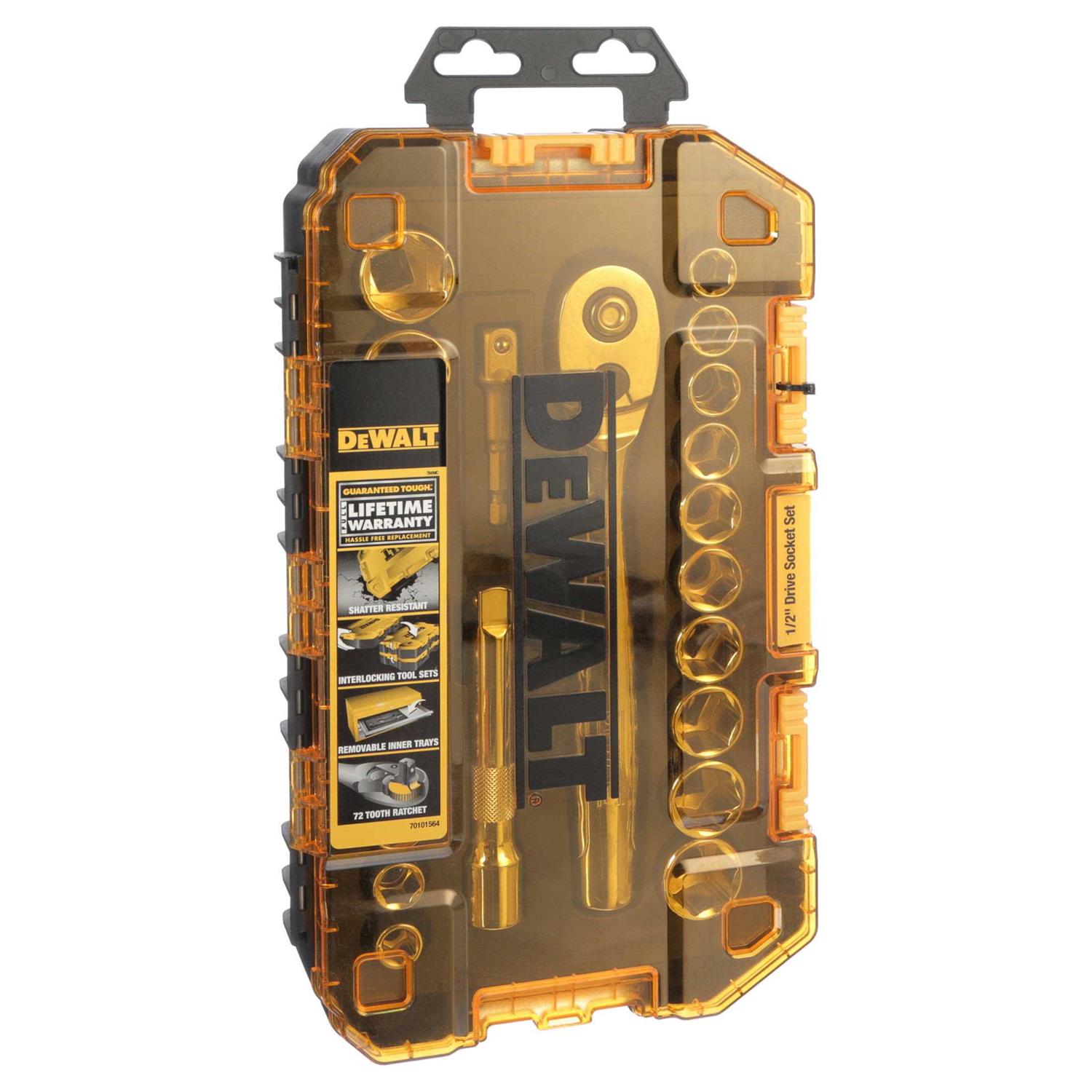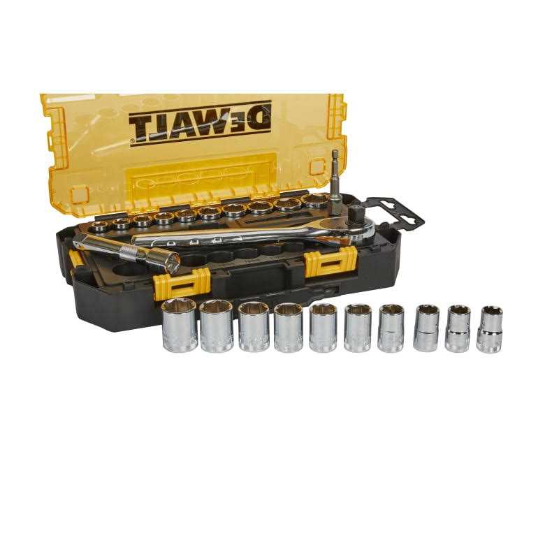 With the DEWALT 23 Piece 1/2″ Drive Combination Socket Set (DWMT73813), you can be sure you have the right tool for the job. The set includes a variety of sockets and accessories for your convenience. The sockets include DirectTorque technology to help prevent rounding of fasteners and to provide better grip.