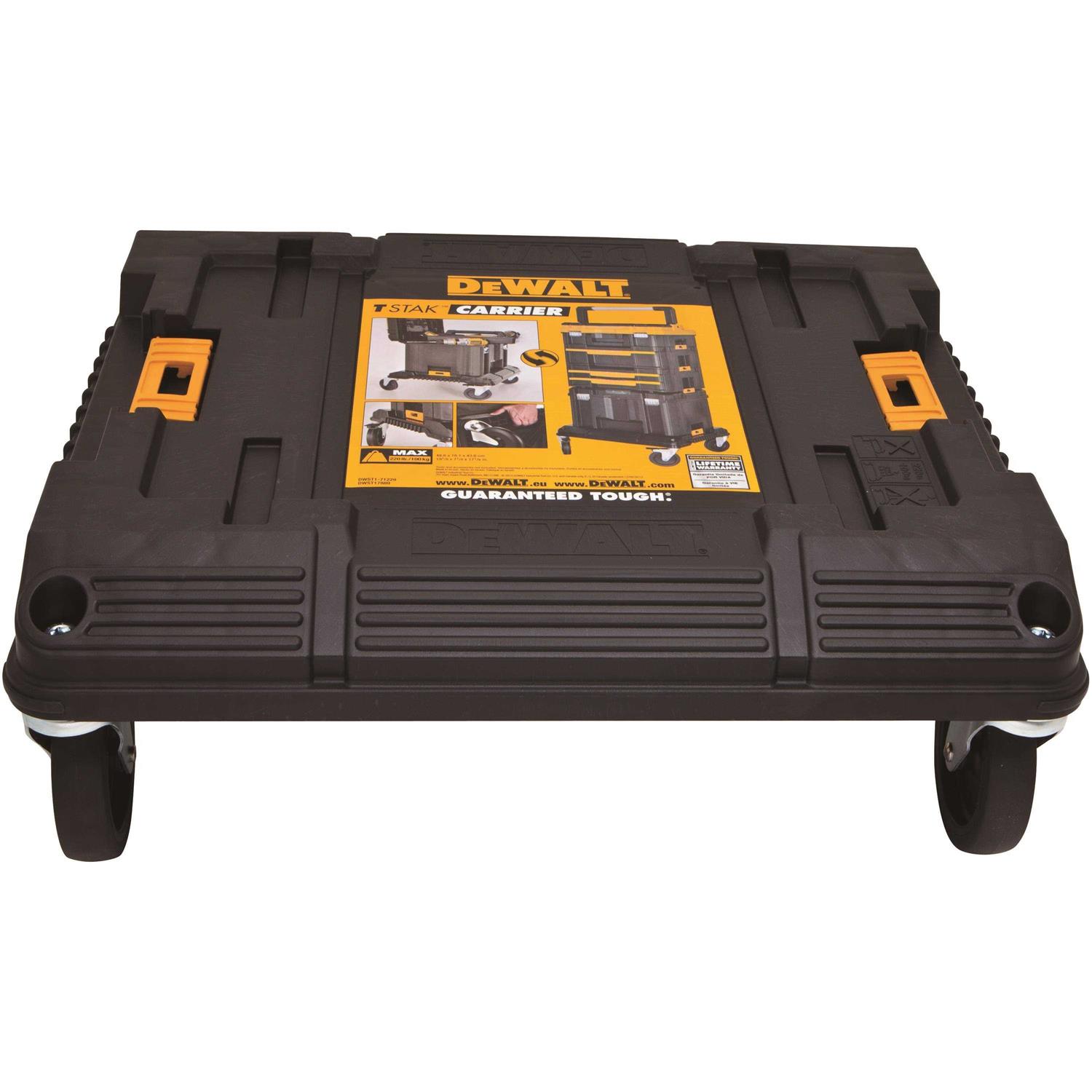 The DEWALT TSTAK Cart is ideal for holding and moving around your various tool and accessory boxes. This cart is part of the innovated DEWALT TSTAK system of interlocking, stackable storage boxes and is compatible with all other items from the collection. It has a maximum weight capacity of 220 pounds, so you can use it to hold every item that your job requires. The plastic wheeled cart is lightweight; at just 7.13 pounds you can carry it wherever you need to go, and you can hang it from the wall to save floor space when you aren’t using it to move boxes. This cart’s base features a locking mechanism to hold the stack of boxes securely and prevent accidents. It features incredible maneuverability thanks to its four rotating wheels.