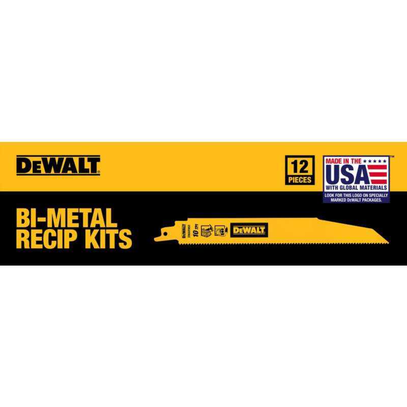 DeWalt Bi-Metal Reciprocating Saw Blade Set These reciprocating saw blades last up to 50% longer than standard blades and feature patented tooth forms that deliver fast, smooth cuts in wood or metal-cutting applications. Their Bi-Metal construction is designed to extend blade life and minimizes blade breaks. Each kit contains an assortment of blades for a variety of cutting applications and a collapsible ToughCase for easy storage. Made in the USA with global materials.