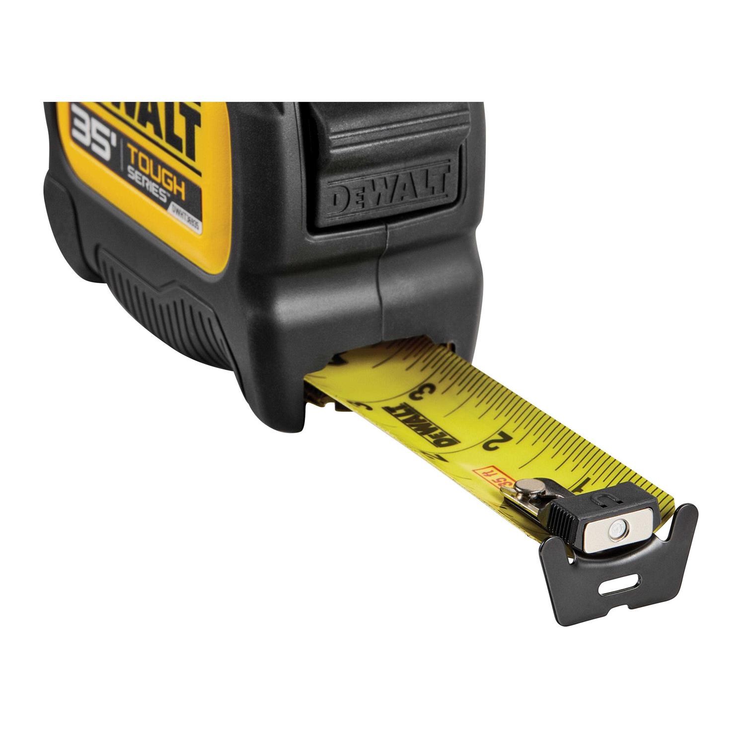 With the ability to survive drops up to 100 ft., this ToughSeries 35 ft. Tape Measure redefines the standard of tough. Tackle lengthy measurements without help with 17 ft. of max reach. Versatile ToughSeries tape measures allow you to conveniently measure from any angle and are the first in the DeWalt family to have double-sided print. Quickly measure metal materials with the removable hook magnet while patented hook connection technology gives you full control on the jobsite. The hook is equipped with 6 in. of Rip-Shield blade coating for defense against wear-and-tear and the durable tapeline finish protects the entire length of the blade for enhanced endurance.