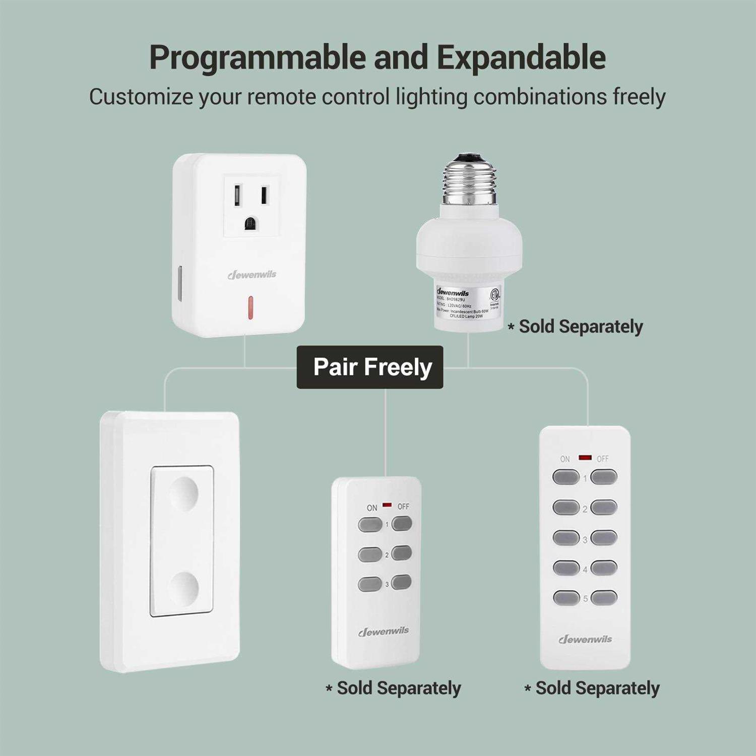 DEWENWILS Wireless switch and outlet, remotely turn on/off indoor lighting fixtures, plug-in pendant, lamps, hard-to-reach lights, and other electric appliances with a push of a wall switch. The white wall-mountable switch fits any room dcor easily. Detachable wall mounted switch can also work as handheld remotes. Strong RF signal works through walls and doors without any interference. does not require line of sight while using; up to 100ft range in open areas; Transmitter and receiver have been pre-programmed for immediate use.