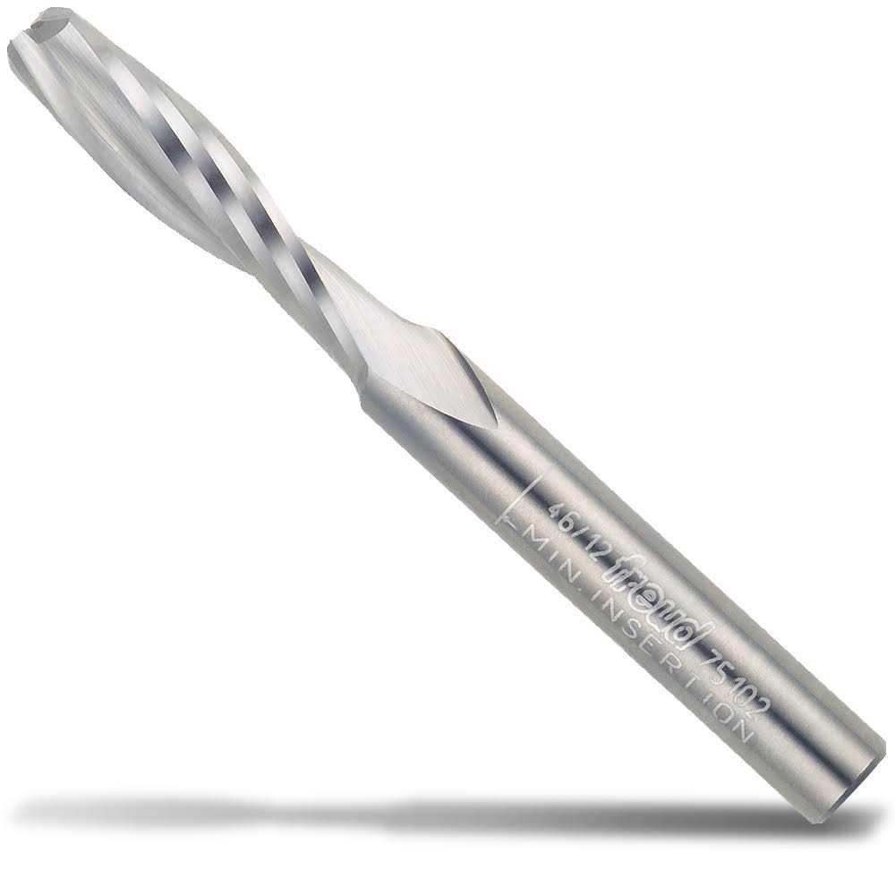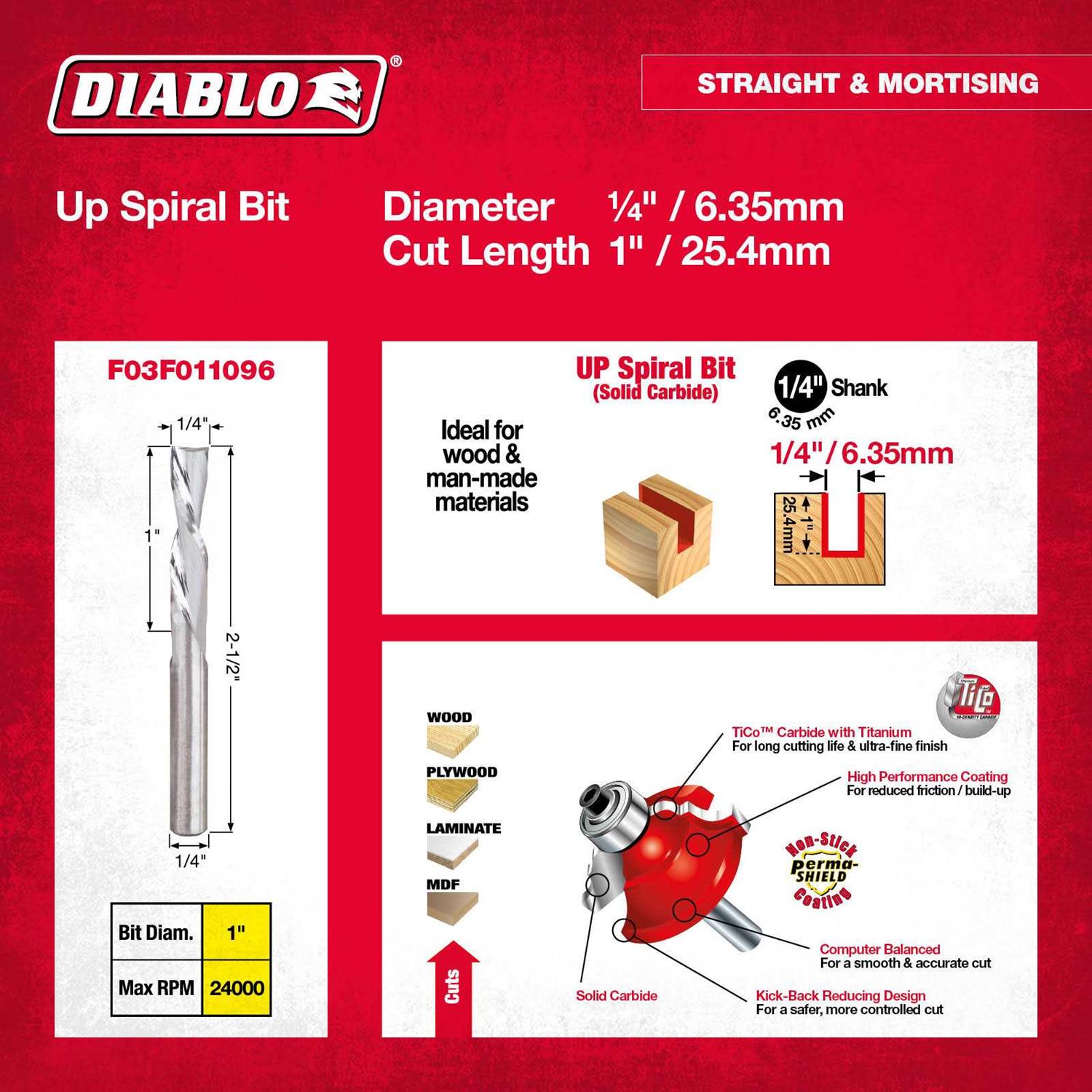 A kickback-reducing design and high-grade composition make this Diablo 1/4 in. x 1 in. Carbide Up Spiral Router Bit one smooth-operating accessory. Suitable for use on wood and manmade material, this durable carbide bit produces safe, precise cuts and features tri-metal brazing to reduce vibrations and impacts. Delivers a precise, safe cut in both wood and manmade material High-density carbide body with titanium construction offers a long cutting life 1/4 in. Cut diameter with 1 in. maximum depth produces consistent swaths Kickback-reducing design allows steady operation Requires a minimum chuck size of 1/4 in.