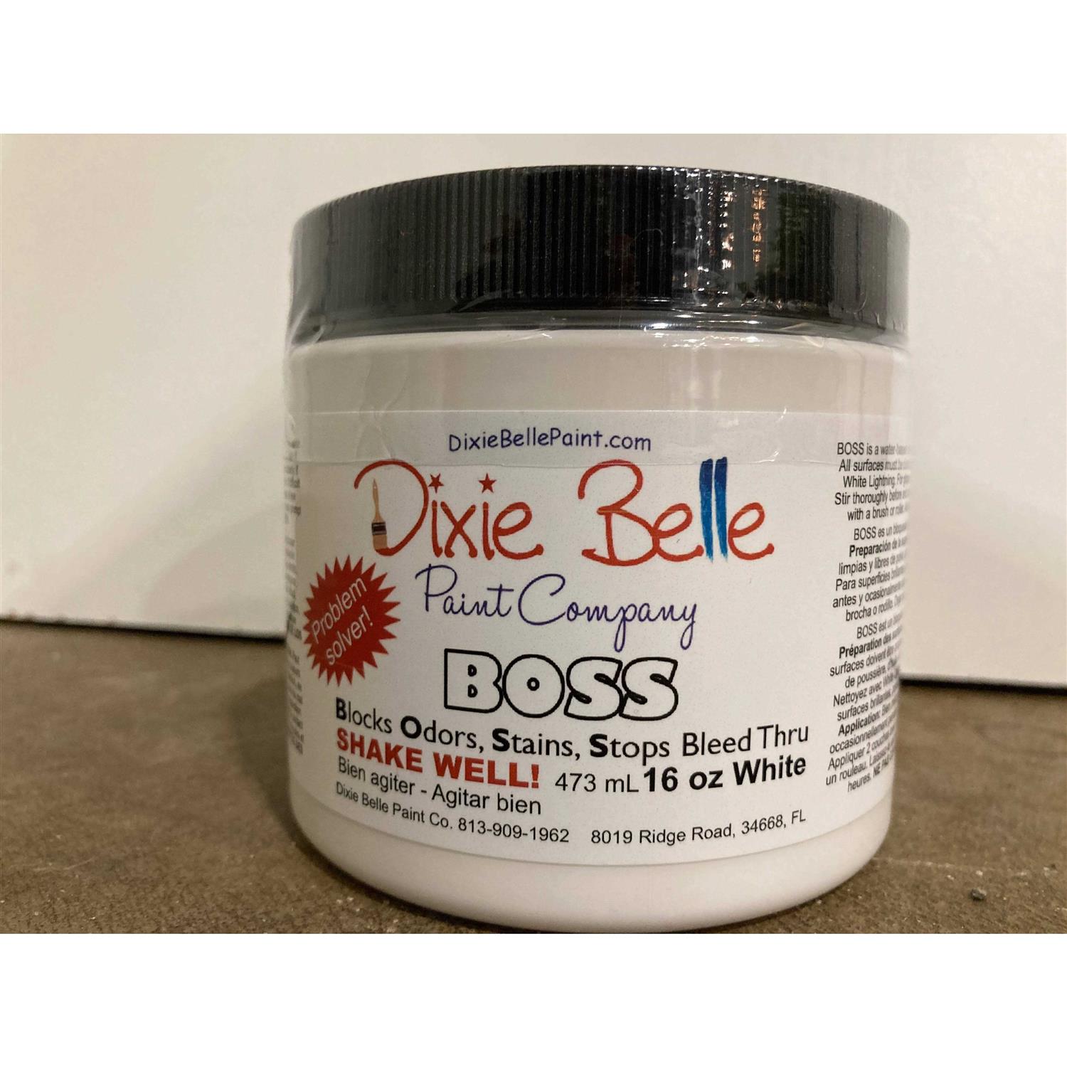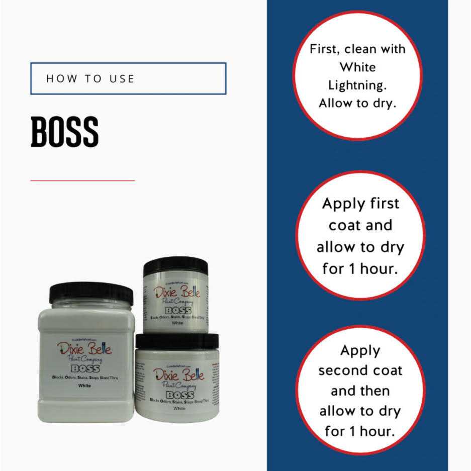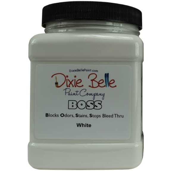 BOSS blocks odors, stains, and stops bleed thru. BOSS is a problem solver product and not needed for every project. In two coats, BOSS tackles tough set in stains including permanent marker, water stains, and much more. BOSS even masks smoke odors and nicotine smells. Clean first with sugar soap and then apply BOSS. Allow to dry approximately one hour. Apply a second coat of BOSS and allow to dry for one hour before painting with Dixie Belle Paint. Available in Clear, White, and Gray. WARNING: Harmful if swallowed; keep away from eyes and children.