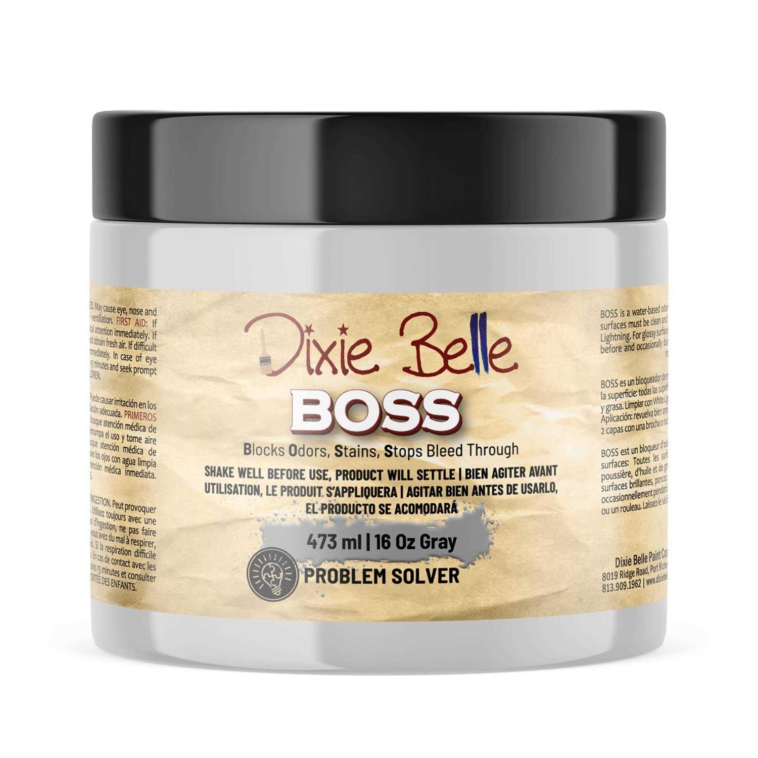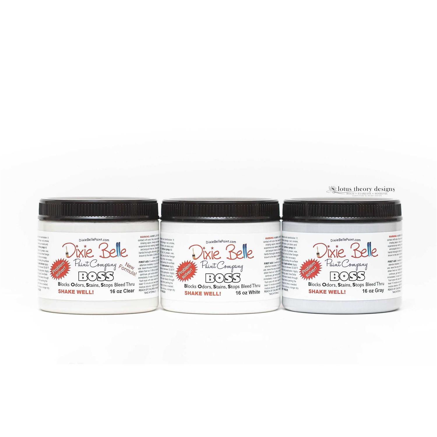 BOSS blocks odors, stains, and stops bleed thru. BOSS is a problem solver product and not needed for every project. In two coats, BOSS tackles tough set in stains including permanent marker, water stains, and much more. BOSS even masks smoke odors and nicotine smells. Clean first with sugar soap and then apply BOSS. Allow to dry approximately one hour. Apply a second coat of BOSS and allow to dry for one hour before painting with Dixie Belle Paint. Available in Clear, White, and Gray. WARNING: Harmful if swallowed; keep away from eyes and children.