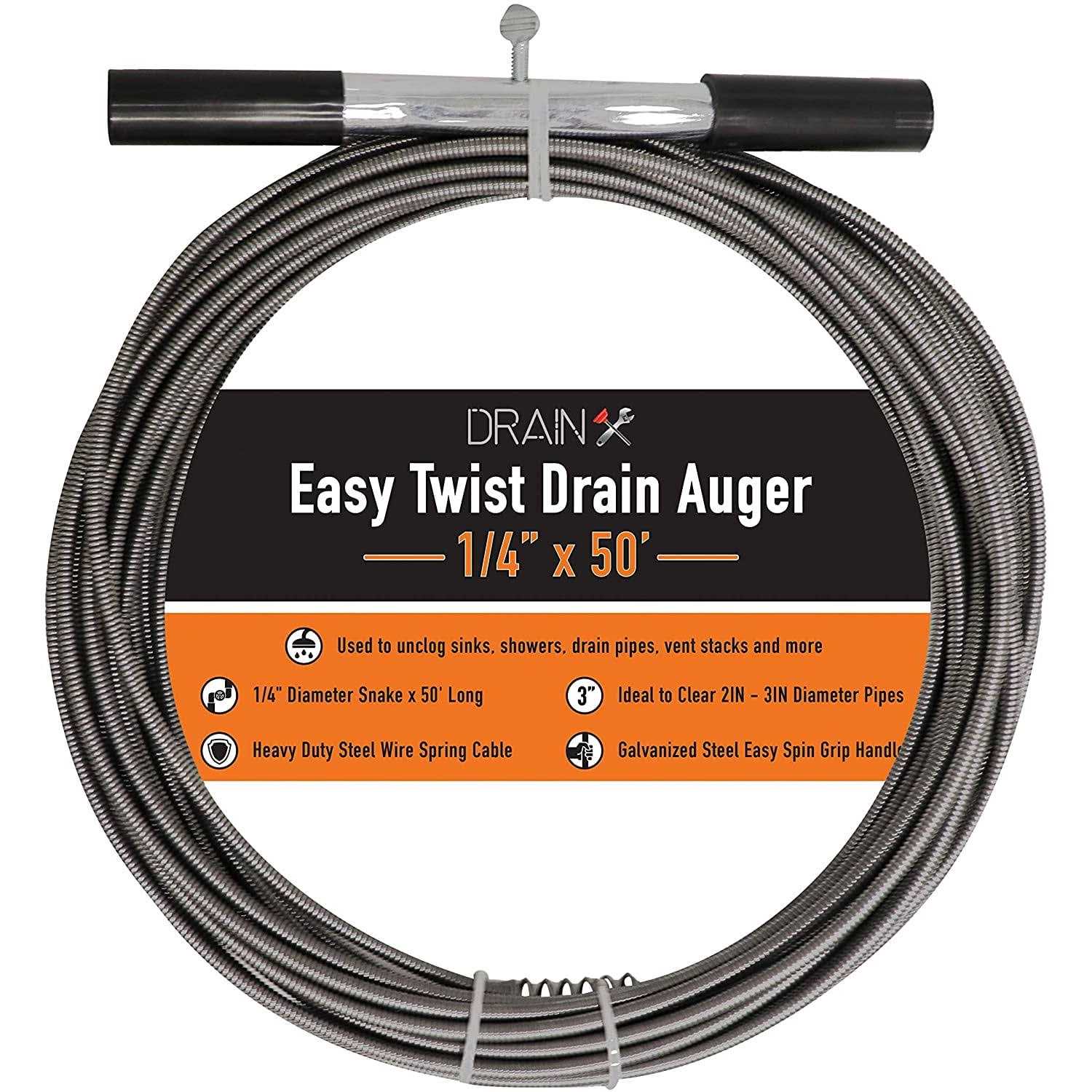 - 50 FT 3/8 Inch diameter Drainx Easy Twist augers, essential plumbing kit is flexible and helps clean up stubborn clogs