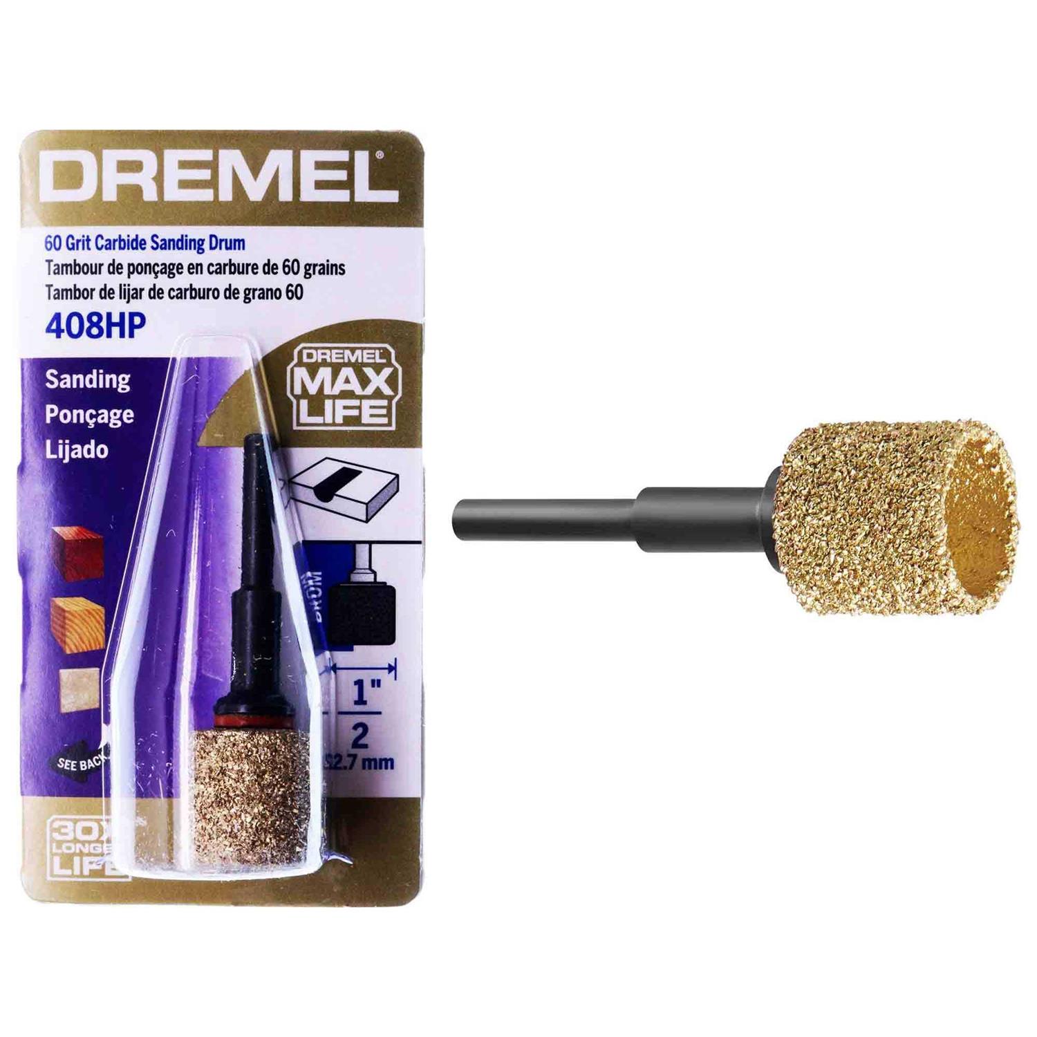 Dremel’s line of Max Life high-performance accessories provides long-lasting performance and impressive durability. Built to give DIYers longer lasting, stronger performing, versatile accessories. The Maximum Life 408HP Carbide Sanding Drum/Hole Saw Bit is engineered to last 30X longer than the Dremel 408 Sanding Band. Carbide coating provides added durability to the surface of the drum and will not tear loose like other ordinary sanding bands. The Max Life Carbide Hole Saw Bit functions as both a sanding drum and a hole saw capable of plunge cutting into a variety of materials. Ideal for a variety of materials including ceramic wall tile, hard and soft woods, composites, fiberglass, Masonite boards, rigid foam, gourds and more. (12.7 mm) 408HP features a coarse 60 grit carbide abrasive that provides a sanded finish as it cuts. Mounted on an extra strong, 1/8 in. Dia steel mandrel the Sanding Bit allows users to move laterally or orbitally to smooth out surfaces, enlarge holes or create irregular cavities. Maximum operating speed is 35,000/min.