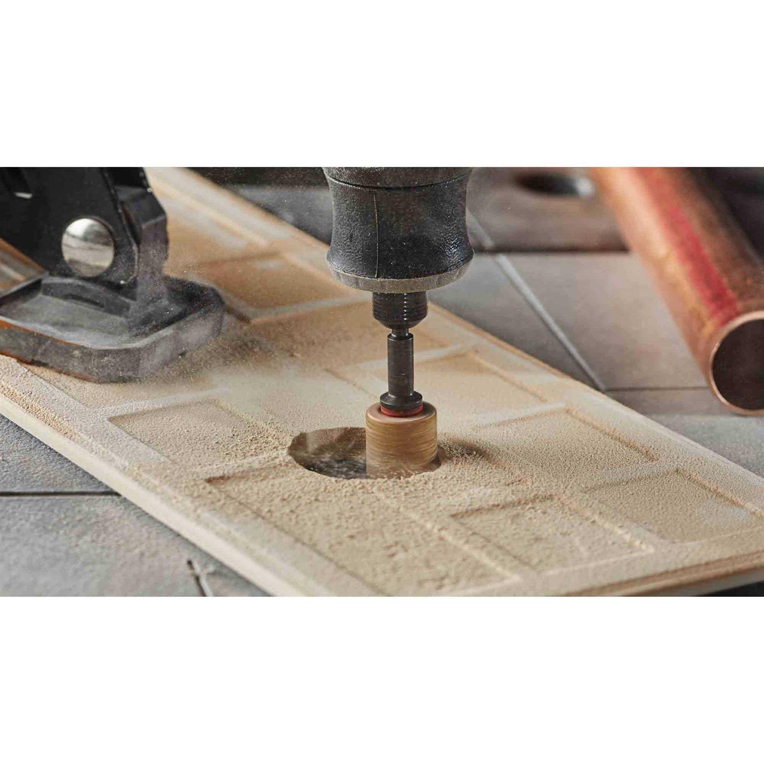 - Functions as both a sanding drum and a hole saw capable of plunge cutting into a variety of materials.