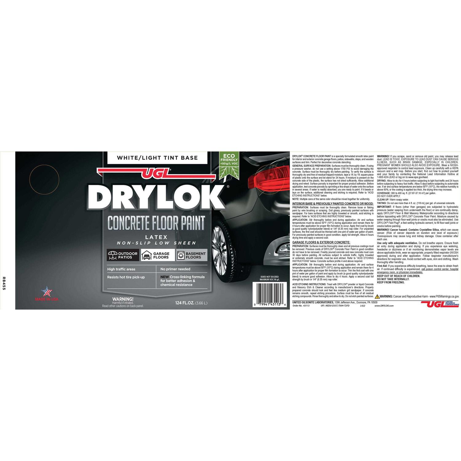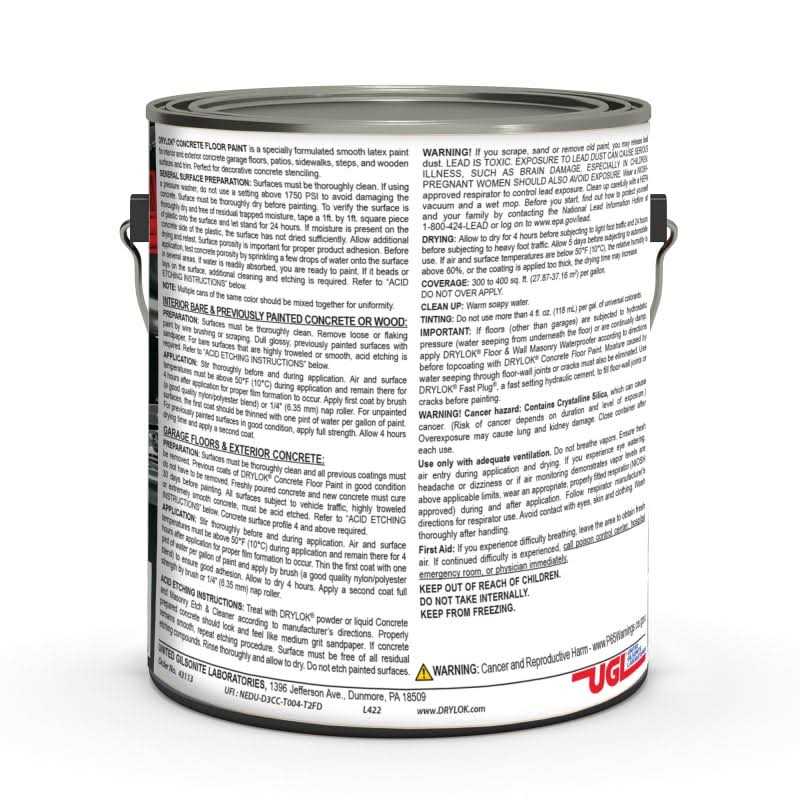 DRYLOK Latex Concrete Floor Paint is an all-in-one paint and primer. It’s scientifically formulated to protect and decorate interior and exterior masonry floors in homes as well as commercial and industrial spaces. The attractive, flat, non-slip formula is effective on both new and previously painted surfaces, outperforming ordinary floor paint when subjected to traffic, washings, weather, acids, and alkalis.