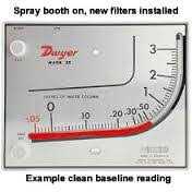 Manometers by Dwyer. Details:The Dwyer Mark II 25 inclined differential manometer with red gauge fluid has a 0 to 3 inH2O measuring range, built in zero level and molded plastic case for monitoring air velocity and air filter performance, and taking pressure measurements above and below atmospheric pressure. Red gauge fluid is freeze-proof and has lower evaporation rate for use in cold environments, and produces expanded scale viewing for improved reading resolution. The built-in zero level provides linear calibration. The manometer has a styrene-acrylonitrile housing, indicating tube, and fluid wells for strength and durability. The molded ABS knobs and zero adjust plunger and shock-mounted glass level vial are wear-resistant. Leakproof O-ring seals and overflow tank reduce the risk of fluid loss. Scales are lithograph printed on aluminum to ease reading, and are epoxy coated to protect against wear. The manometer can be mounted on any vertical surface.