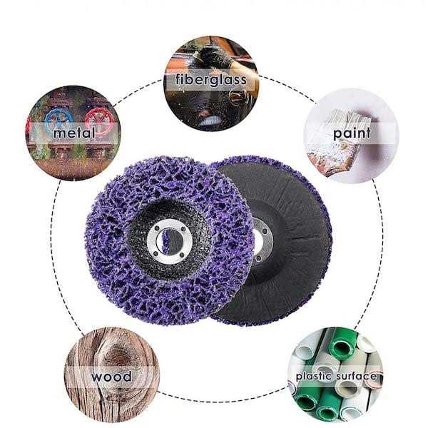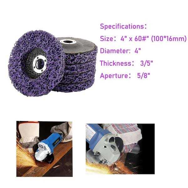 This paint removal disc uses fiber mesh as a carrier, and uses resin elastomers to attach sharp abrasives to the fiber mesh firmly . When polishing at high speed, the paint rust remover will not fall off which means it is durable and sturdy. Paint removal wheel can be used to polish the surface of steel, plastic, new fiber products, stone, concrete, etc. Really suitable to use for polishing the complex surfaces or deep holes of various metals or non-metals, especially suitable for uneven surface and side grinding. This paint removal disc uses fiber mesh as a carrier, and uses resin elastomers to attach sharp abrasives to the fiber mesh firmly . When polishing at high speed, the paint rust remover will not fall off which means it is durable and sturdy. Paint removal wheel can be used to polish the surface of steel, plastic, new fiber products, stone, concrete, etc. Really suitable to use for polishing the complex surfaces or deep holes of various metals or non-metals, especially suitable for uneven surface and side grinding. Diameter: 4″/100mm; Hole:5/8″(16mm); Color: Purple; Maximum Speed: 12500RPM Grinder abrasive wheel discs remove the paint or rust without damaging the original surface quickly. Less dust and low noise.