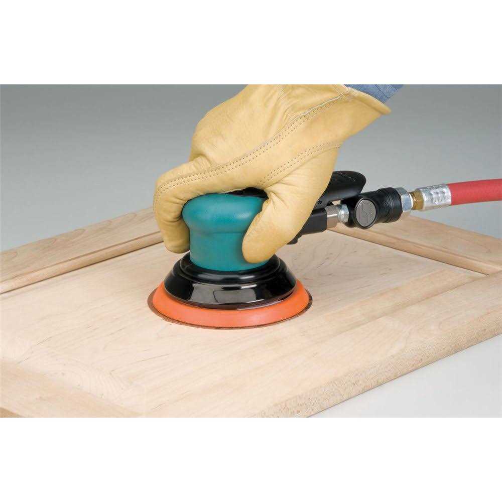 Air Random Orbital Sander, 0.25 HP, Pad Size 5 In., Orbit Dia. 3/16 In., Vinyl Pad Face Type, Spindle Size 5/16 In.-24, Free Speed 12,000 rpm, 3.5 Average CFM @ 15 Second Run Time, 14 CFM @ Full Load, Required Pressure 90 psi, Air Inlet 1/4 In. NPT, Min. Hose Size 1/4 In., Overall Length 6-1/2 In., Rear Exhaust Type, Variable Speed No, Rubber Handle Material, Rubber Housing Material, Lever Throttle, Vacuum/Non-Vacuum Non-Vacuum