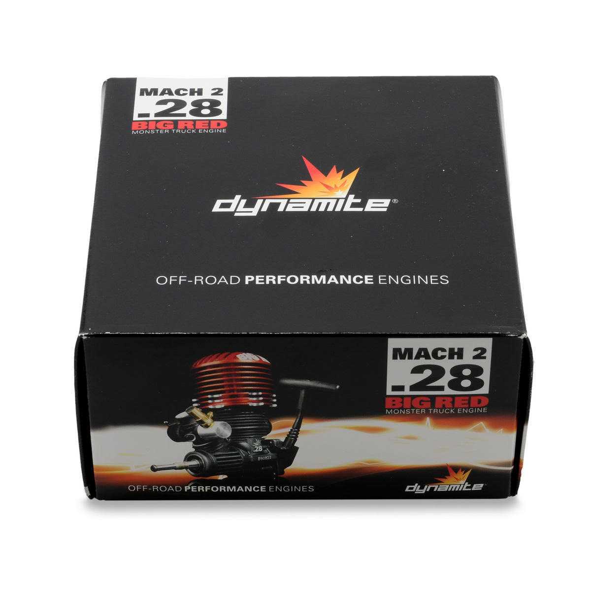 Key Features13mm turbo ported crankshaft2-needle carburetorABC 6-port piston and sleeveKnife edged connecting rodPull start/Spin-start combo equippedOverviewThe Dynamite? Mach? 2 Big Red .28 monster truck engine was engineered for superior torque and durability allowing you to unleash the full potential of your nitro monster truck. With features borrowed from the popular Dynamite Platinum Series, Big Red is a force to be reckoned with. Not only does the engine boast a 13mm turbo ported crankshaft as well as an ABC 6-port piston and sleeve, it also stands out with its oversized aluminum cooling head with Big Red etched on the top of the head. Look no further – the Dynamite Big Red engine leaves the competition in the dust.