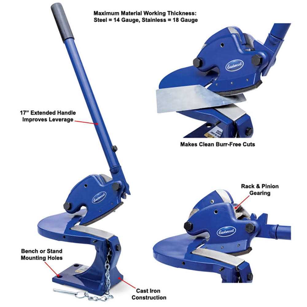This is not your typical metal cutter. Our rugged, cast iron throatless shear allows you to make straight, intricately curved and irregular cuts in metal with ease and accuracy. Throatless hand shear design amplifies leverage with rack and pinion gearing and an extended handle, so youll easily slice through 14-ga. mild steel, 14-ga. aluminum and 18-ga. stainless. Tool steel blades (adjustable for wear) provide burr-free cuts. Metal cutters base has three holes for mounting this throatless hand shear on your workbench or stand Specifications Maximum Cutting Thickness: 14 Gauge Mild Steel 14 Gauge Aluminum 18 Gauge Stainless Steel Contents (1) 4 Metal Shear (1) 17 Handle Age Group: adult.