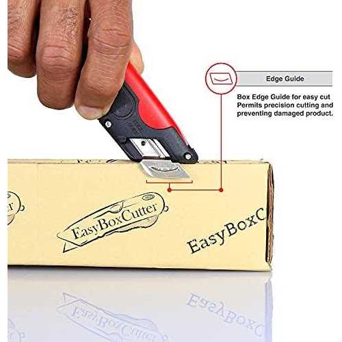Easy Cut Modern Box Cutter, extra tape Cutter at back, dual side edge guide, 3 blade depth setting, 2 blades and holster