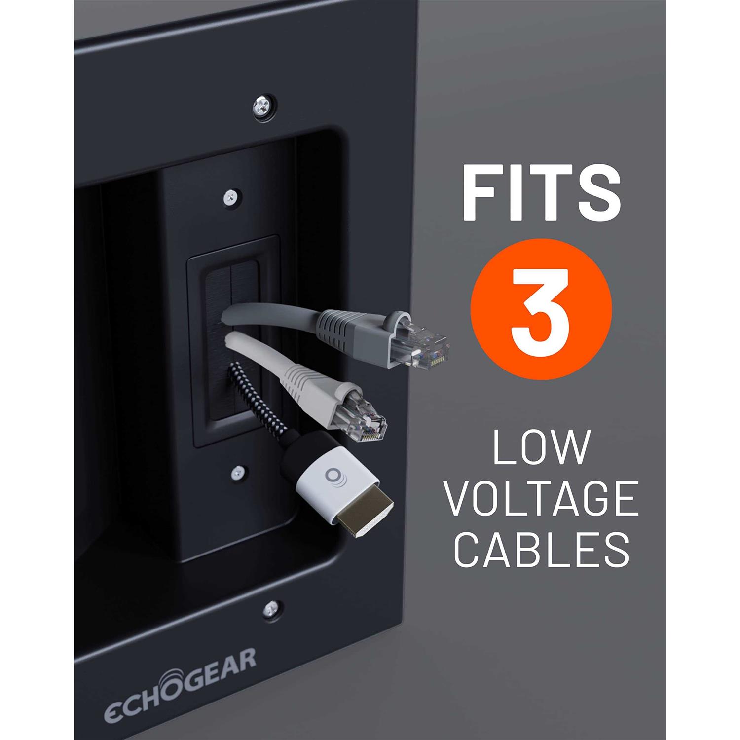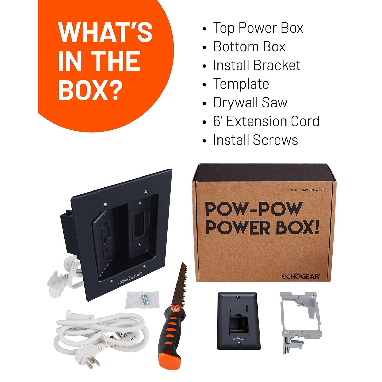 Power your devices and hide all the cables behind the wall. Includes 2 standard AC plugs, 2 USB-A ports, and low voltage pass through. Comes with everything you need for a quick & clean install, no wiring required. Show your wall who’s boss with the included wall template & drywall saw. Do you have weird plugs? Don’t feel bad. The dual top outlet has plenty of space to fit awkwardly shaped power plugs. Power your TV, streaming device, and LED lights all in one location. Use the brush plate pass-through to hide your HDMI, ethernet, and audio cables. Unique cable catching design means your wall won’t eat your cables, although they do look delicious. Includes a 6ft extension cord with a low profile plug to power the whole kit. Using an outlet further away? Any normal 3-prong extension cord will work. Our ECHOGEAR Pros are here to help 7 days a week. So you finally got your TV on the wall and dangling cables are driving you nuts. Been there. Use this all in one cable management kit to hide your TV wires for good. Powers 2 devices with room for 3 low voltage cables (HDMI, audio, etc). Get those cords out of the way and get back to lounging on the couch with your squad. A Shagadelic Cable Management Kit Some cable management kits leave you hanging out to dry like yesterday’s laundry. They don’t come with a cutting template or saw. Some even require you to do the wiring. Yikes. One false move and you’ll catch a jolt that’ll leave your hair looking like Doc Brown. Most install manuals are more confusing than the movie Raising Arizona. You’ll be able to set up this in-wall cable management kit in under 30 minutes. A half-hour in exchange for a lifetime of kickin’ it cable-free? What more could you ask for? So… How Do you Install It? The first thing to do is decide where you want the in-wall boxes to be. There can be up to 6′ between the top and bottom boxes. If you’re using the included extension cord, make sure you’re less than 6′ from an outlet. Can’t get that close? Any 3-prong extension cord will work, so raid your Christmas decoration box for a spare cable. Now slap the template on the wall so you’ll know exactly where to cut & won’t jack up the wall. Here’s the fun part, grab the drywall saw and get after it. For safety, I like to test saw blade sharpness by using it to open up a bag of America’s #1 finger hat, Bugles. Now that you’re 3/4 of the way into those Bugles, use the template to cut perfectly shaped holes in the wall. Next, you’ll run all the cables through the wall connecting them from the top to the bottom box. Finally, connect the wall plates to the wall with a screwdriver & bam, you’re done. CMIWP2
