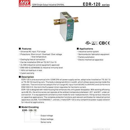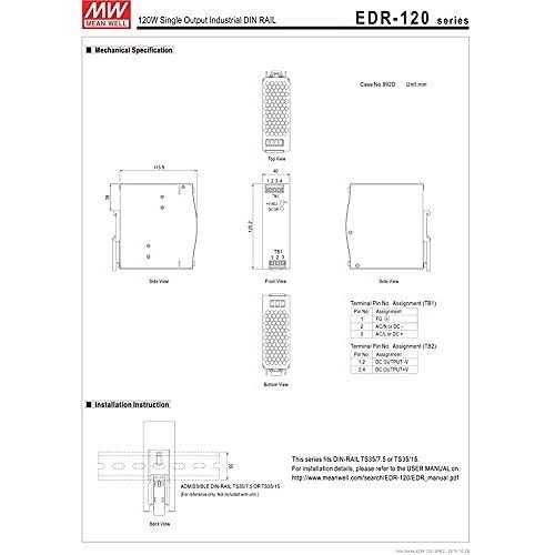 Wiring & Connecting by MEAN WELL. Details:Single output DIN rail power supply 24 Volts 5 Amps 120 Watts 24 Volts 5 Amps specifications output power (W): 120 ripple & noise (mV p-p): 100 load regulation (): 1 percent line regulation (): 0.5 percent efficiency: 87.5 percent size (L x W x H) inches: 4.5 x 1.6 x 4.25 output connector Type: screw terminal efficiency ( percent ): 87.5 operating temperature-min (CEL):-20 operating temperature-max (CEL): 60 Length (inch): 1.57 width (inch): 4.93 height (inch): 4.47 agency approvals: UL/ cul/ TUV/ CB/ CE color: silver style: DIN. Primary output voltage (vdc): 24 Output current (a): 5 Maximum output power (w): 120 Family: edr-120 Input voltage (vac): 90 to 264
