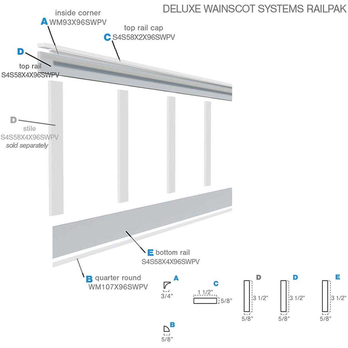 Ekena Millwork WPKP0404X96BBDS Deluxe Wainscot Systems RailPak 8′ Length, 3 1/2 Top Rail & 3 1/2 Bottom Rail, White