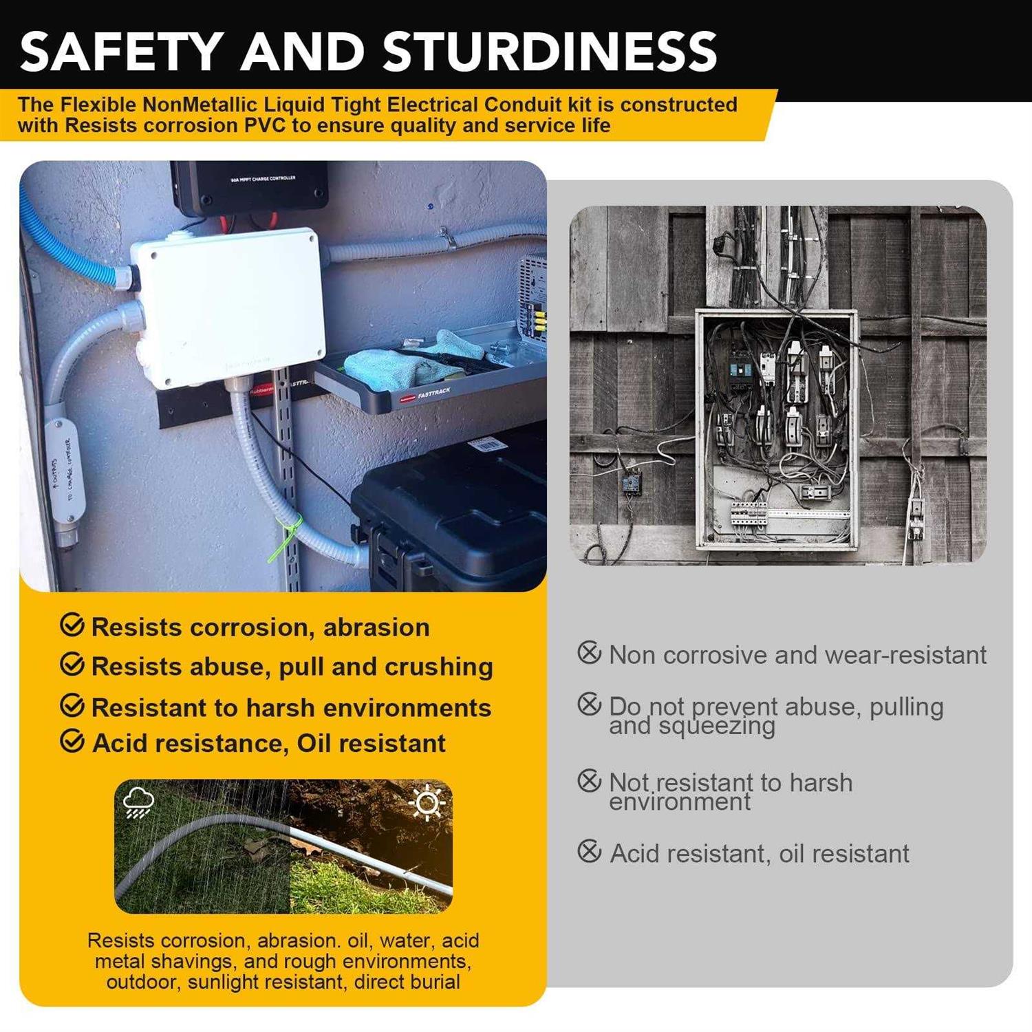 【PREMIUM Liquid-Tight Conduit】- Made from high quality virgin PVC. Smooth inside for easier wire pulling, no hazardous sharp edges or burrs, will not damage conductors. Light weight and lower installed cost. Quick installation, cuts with utility knife or PVC cutter. Integral rigid & flexible PVC construction 【Safety and Sturdiness】-Flex conduit 3/4 Resists corrosion, abrasion, oil, water, acid, metal shavings, and rough environments; resists abuse, pull and crushing; outdoor, sunlight resistant, direct burial,50% lighter than metallic conduits 【Effortless Installation】-The liquid tight conduit 3/4 Fits is fast, and only one person can complete the work in a few minutes. flexible conduit 3/4 connector is safe to use and does not require any tools. you can simply tighten the dome sealing nut by pushing the conduit or pipe onto the ferrule 【Wide Application】 HVAC Equipment, machine tools, marine equipment, motors and controls, printing equipment, pumps, refrigeration equipment, transformer connections, outdoor lighting 【Complete Accessories】-3/4-Inch 50 Foot Flexible Electrical Conduit with 5 Straight and 3 90-Degree Conduit Connector Fittings.Flexible Electrical Conduit Length: 50′,ID:3/4inch,OD:1inch,Thick: 2.5 mm UL Listed Underwriter’s Laboratories File No. E529256 Why choose Elecoman Liquid-Tight Conduit and Connector Kit? /b br br Approximately 50% Lighter br Easier to cut br No sharp edges or burrs br Lower installed cost br Impact/crush resistant br Obtained UL certification,No. E529256 br br EFFORTLESS INSTALLATION /b br br The Liquid-Tight Conduit Fits is fast, and only one person can complete the work in a few minutes. flexible conduit connector is safe to use and does not require any tools. you can simply tighten the dome sealing nut by pushing the conduit or pipe onto the ferrule br PREMIUM Liquid-Tight Conduit /b br br Manufactured with a strong yet flexible PVC covering that is smooth inside for easy wire pulling, this Flexible Liquid Tight Electrical Conduit is perfect where the conditions of installation or operation require flexibility and protections from liquids, vapors, solids and the elements it is cold, heat and sunlight resistant br br You will get the package: /b br br Sealed electrical conduit × 1 br Sealed straight wire connector connector × 5 br 90 degree conduit connector fitting x 3 br