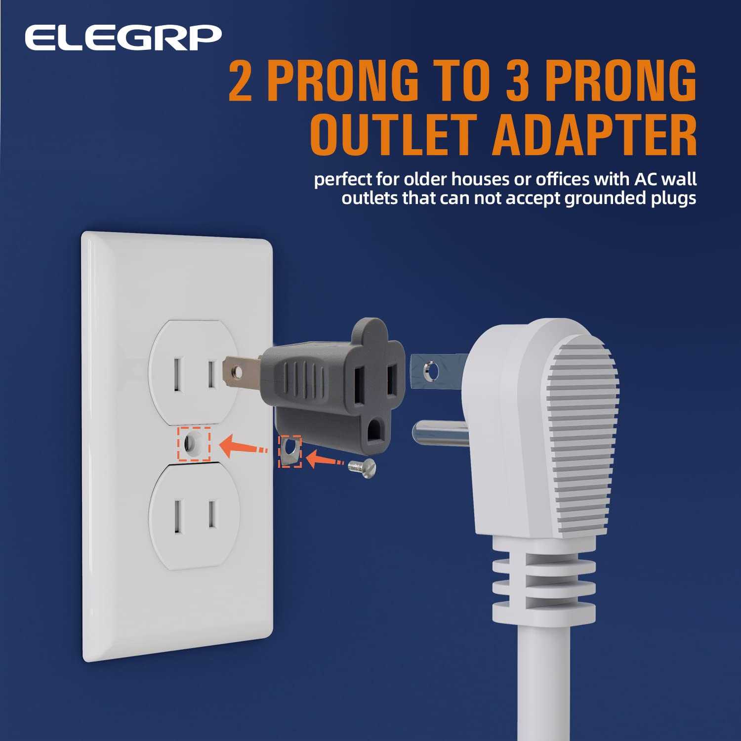 Use this outlet adapter indoors only. ETL Listed. 2 Prong to 3 Prong Outlet Adapter Easy, fast, convenient and inexpensive way, to convert a 2 prong outlet into a 3 prong outlet with grounding protection, perfect for older houses or offices with AC wall outlets that can not accept grounded plugs. Grounding Protection Grounded protection is maintained by connecting the metal clip on this adapter outlet to the middle screw on the faceplate of a grounded outlet box. Polarized Plug This 3-prong to 2-prong grounding adapter is polarized, which ensures neutral-to-neutral, hot-to-hot and provides a measure of safety for the appliances and house wiring to be aligned in terms of polarity. Portable and Easy to Install Small and compact size makes it easy to carry in your toolkit or laptop bag anywhere. Just plug the outlet adapter into your polarized outlet, then fasten the green tab under the metal wall plate mounting screw to complete the grounding path.