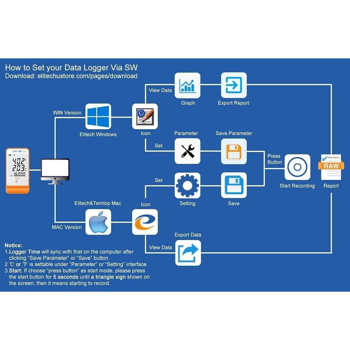 - Parameter Settable- Temperature unit switch, Alarm Range, Logging Interval. For more function, please download Elitechlog software.