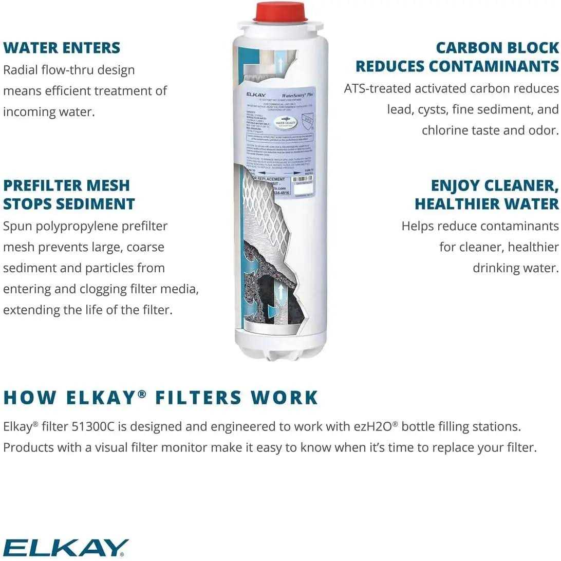 Ensure your drinking water is in top-notch shape with this Elkay 51300C WaterSentry Plus Filter for EZH2O Water Filling Station. This water filter provides clean, great tasting water for all Elkay drinking fountains, water cooler, and bottle fillers. It is compatible with NSF 42, 53, and 372. Your filter should be replaced every 3,000 gallons, or 1 year after installation. This filter was made wtih activated carbon to improve taste, odor, and to reduce contaminants such as lead. Keep on drinkin’ crystal clean water in your Elkay bottle filler station with this Elkay 51300C WaterSentry Plus Filter.