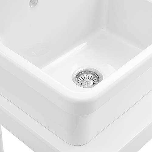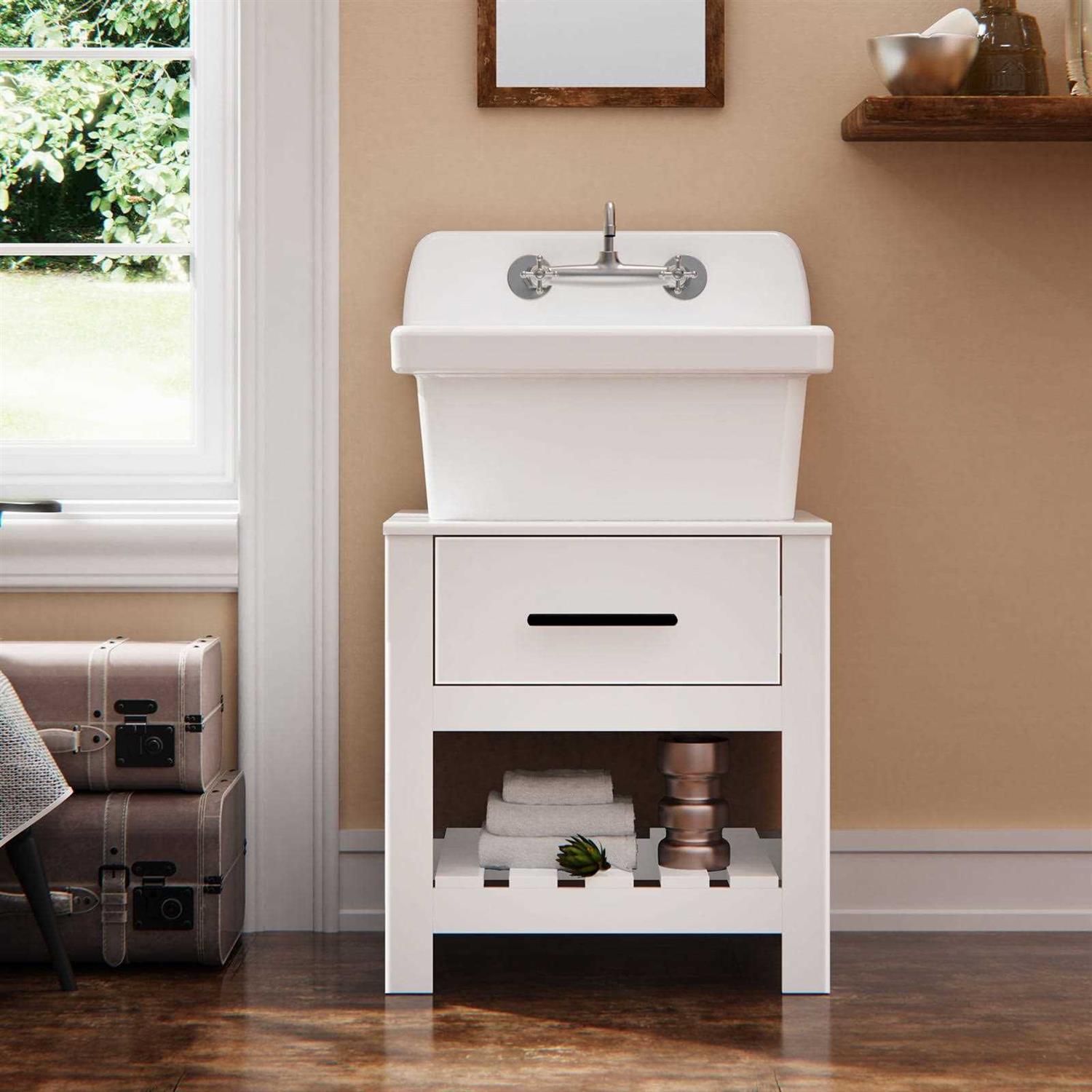 This farm-style utility sink delivers an attractive vintage flair with its crisp angular shaping that is ideal for smaller counter spaces. This sink contains 2 faucet holes and can be mounted within a counter, on the coordinating farm style utility sink table, sold separately, or wall-mounted. The simple but spacious design easily conquers the demands of everyday life. Click Herefor the video of this item. Click Herefor the manual of this item. Various installation methods are possible, such as Wall Mounted (with included bracket), Drop in Mounted, Apron Front Mounted. The non-porous glaze will not absorb odors or stains so sink will look beautiful for years to come. Attractive apron-front with a beautiful gloss white finish. Multi-purpose farm style utility sink provides endless possibilities for clean-up. Two faucet holes measuring 1.38-in each, spaced 8-in apart.