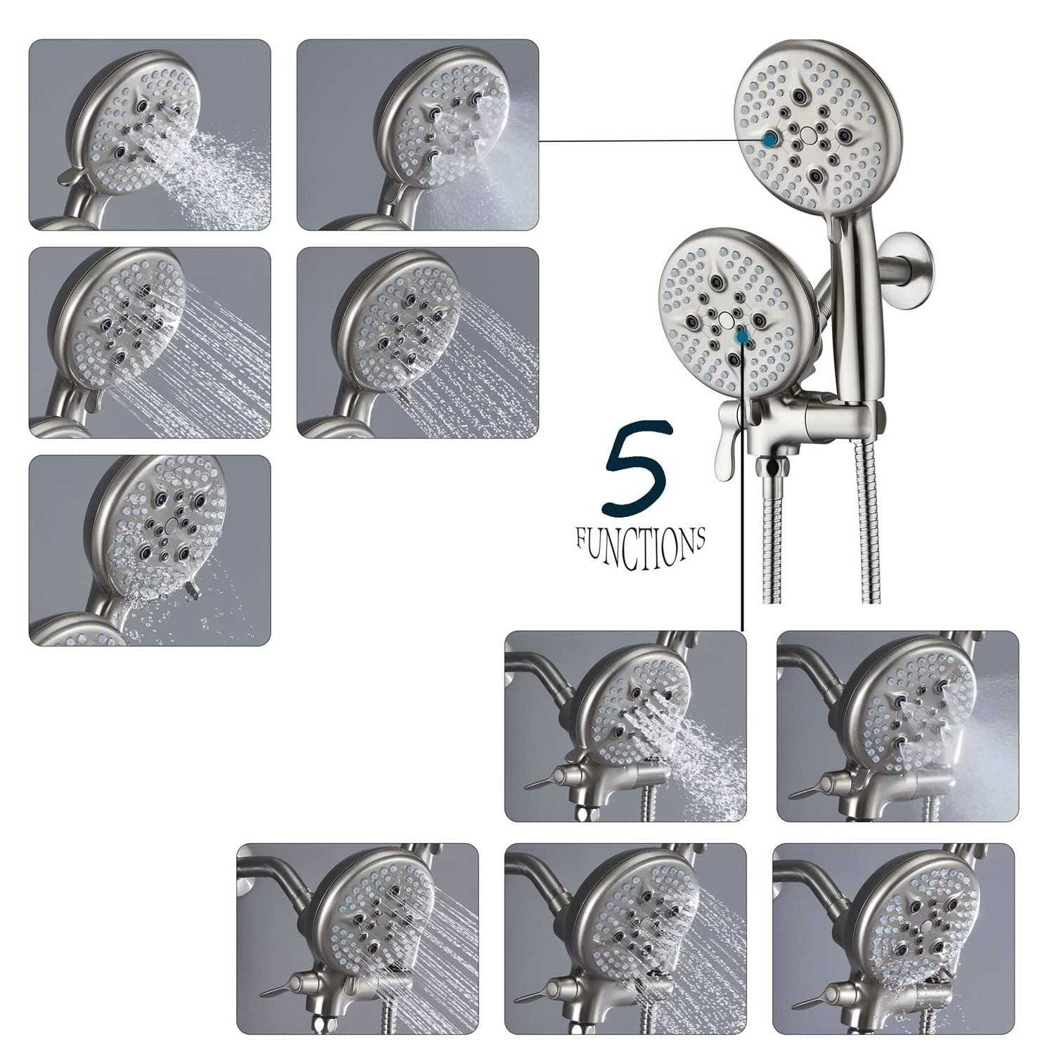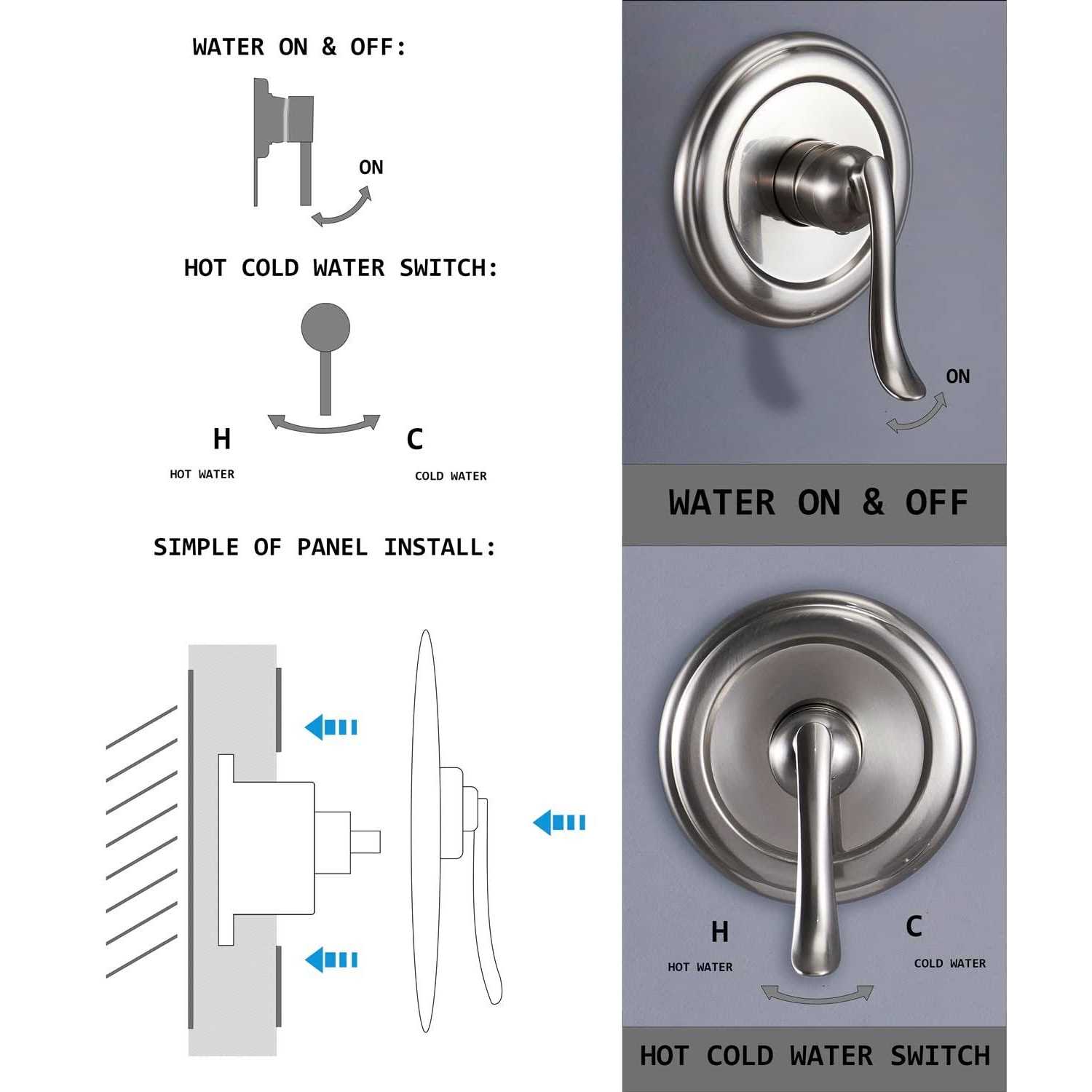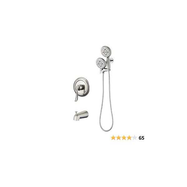 【Protection from Sudden Temperature Changes】 The Monitor Pressure Balanced Valve Cartridge (included) ensures a consistent shower temperature by balancing the pressure of both hot and cold water, so no sudden temperature changes from toilet flushing or running appliances. to avoid sudden temperature changes that affect your pleasure in bathing. 【Bathroom Tub Faucet Set】 Each shower features oversize 5 in. face with click lever dial and rub-clean jets, 5-settings include: rain, pulsating massage, power rain massage, stay-warm mist and pause for instant on/off flow control 【Shower System with Tub Spout】This 5.7 Inches tub spout length, can fill a bathtub in a few minutes.Choosing water to flow upward to your showerhead or downward into the bathtub by Diverter Spout 【Premium Quality Materials】 Premium ABS showerheads with multi-layer processed matte black finish for a concise and smooth appearance, rub-clean nozzles, dirt-resistant surfaces make the shower set durable and easy to maintain, no sharp edges, safer to use 【Single Handle Tub Faucet】 Switch rainfall shower, and tub spout easily with 1-single knob, brass valve cartridge balancing high-pressure water supply, providing stable water flow for a comfortable shower