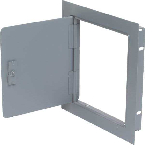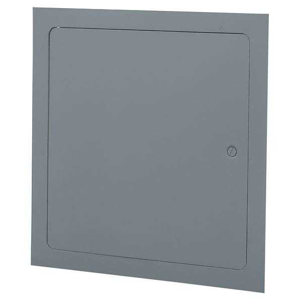 Access door and frame is fabricated from 16-gage, galvannealed steel with a prime coat finish suitable for painting. The door has rounded safety corners and a concealed piano hinge. Frame is one-piece construction with no miters or welds on the face. Latch is screwdriver operated. Standard material thickness is 16-gage.