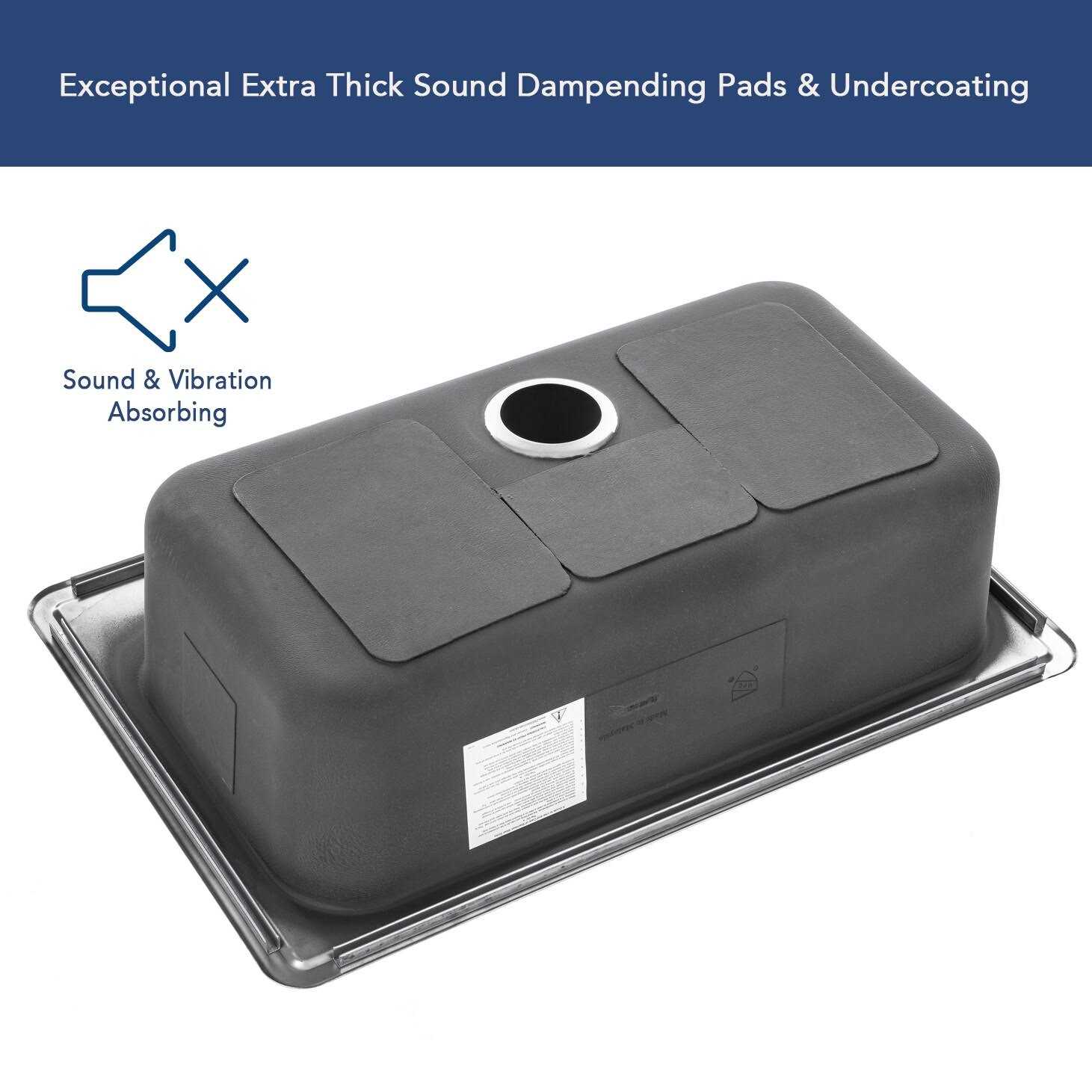 Crafted from high quality premium 18-gauge T304 stainless steel. Topmount rim design allow the sink to sit on top of the countertop. Brushed satin finish deck and bowl. Fully protected by heavy duty sound deadening pads and undercoating for noise reduction. 4 pre-drilled faucet holes, includes 3 faucet caps.