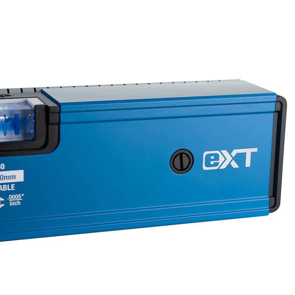 Our eXT Extendable TRUE BLUE Box Levels provides users with the most versatile performance with the ability to extend for exact fit in any job. Our extendable box levels enable users to achieve a perfect fit in custom or odd size applications with constant surface contact for an accurate read across the full length of material. The adjustable sizing of each model allows users to replace up to 6 levels and carry less while maintaining productivity to complete the job. The adjustable slide control mechanism allows for customizable friction fit resistance and long life performance. Our patented e-BAND Vial Technology provides users with superior readability and reliable 0.0005”/in accuracy. The extendable level’s mark & scribe edge allows for continuous scribing across the full length of the level, even when extended. Our eXT Extendable TRUE BLUE Box Levels offers leading versatility and accuracy for all tradespeople and the applications they face on a day-to-day basis. eXT40 extends 24″-40″ and eXT78 extends 48″-78″ for exact fit in any job. Replaces up to 3 level sizes. Adjustable slide control for custom friction fit extension resistance and long life performance. Mark & scribe edge for continuous scribing capability even when extended. e-Band Vial Technology for superior readability & 0.0005″/in accuracy. Tool-free removable end cap allows for scribing accurately into corners. Rear plumb vial window for easy viewing on both sides. Integrated ruler scale for repeat layout applications. High-contrast vial surrounds for improved visibility.
